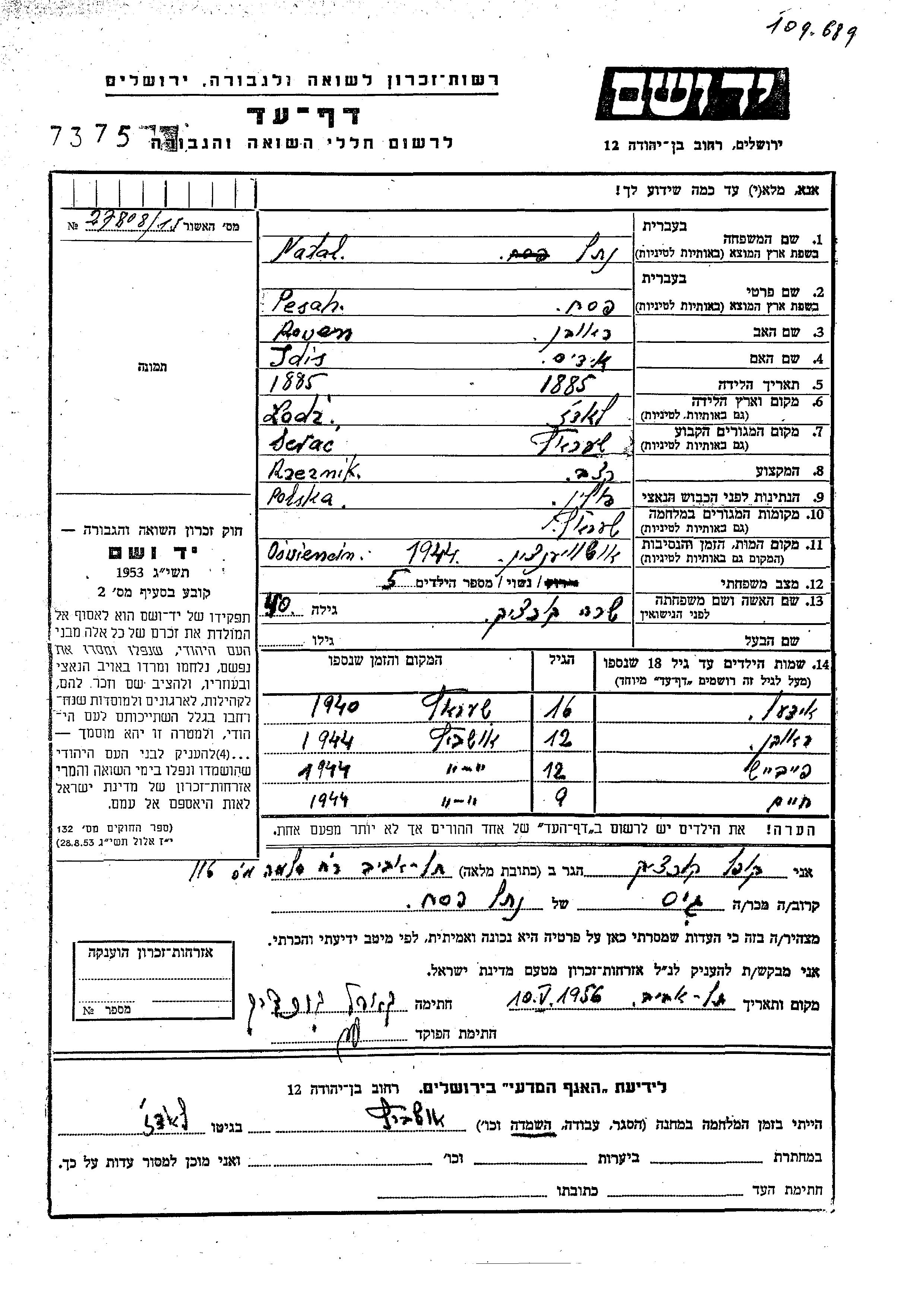 Yad Vashem - Pages of Testimony Names Memorial Collection