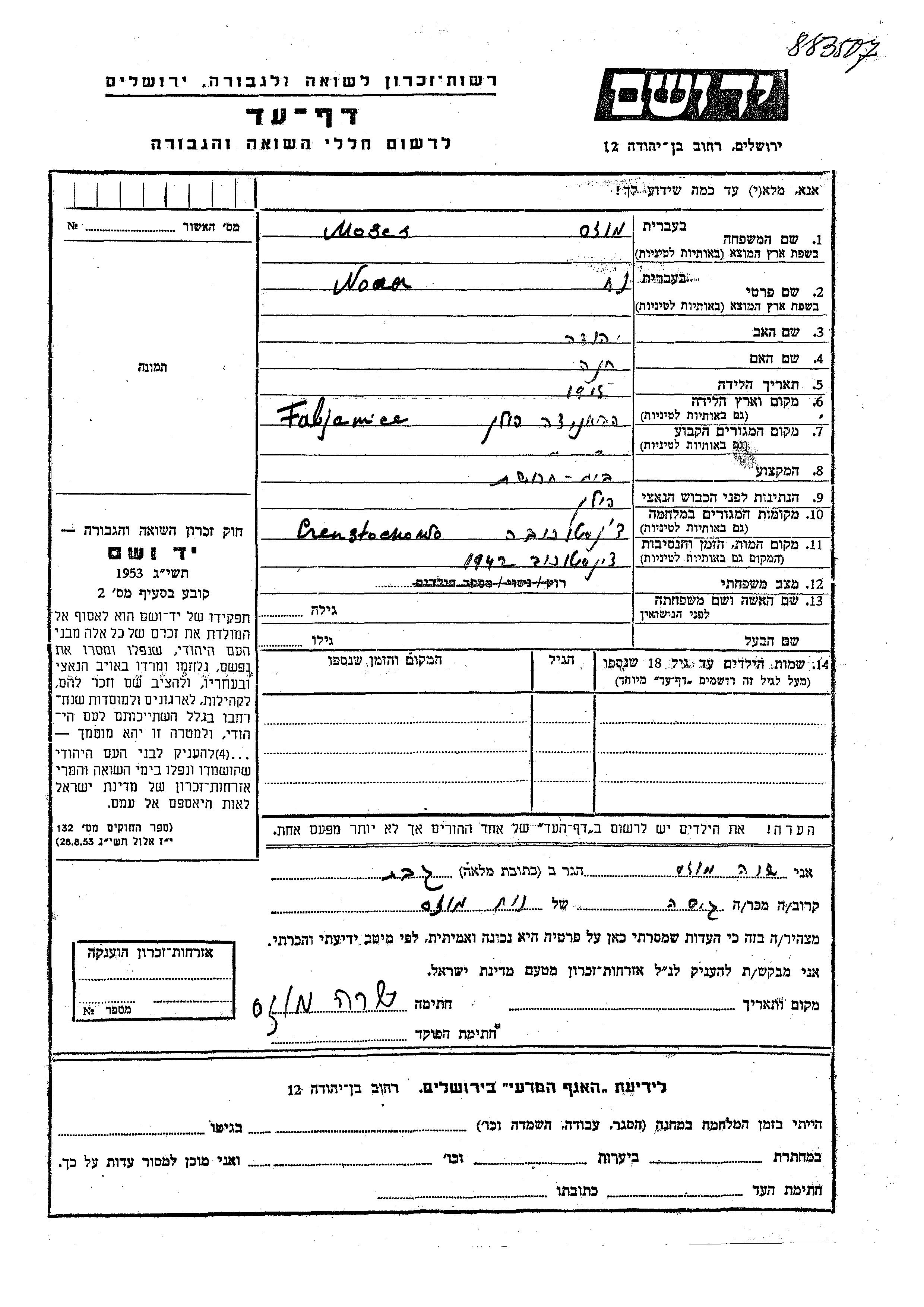 Moses Noach 1915 Pabjanice, Pologne Feuille de témoignage