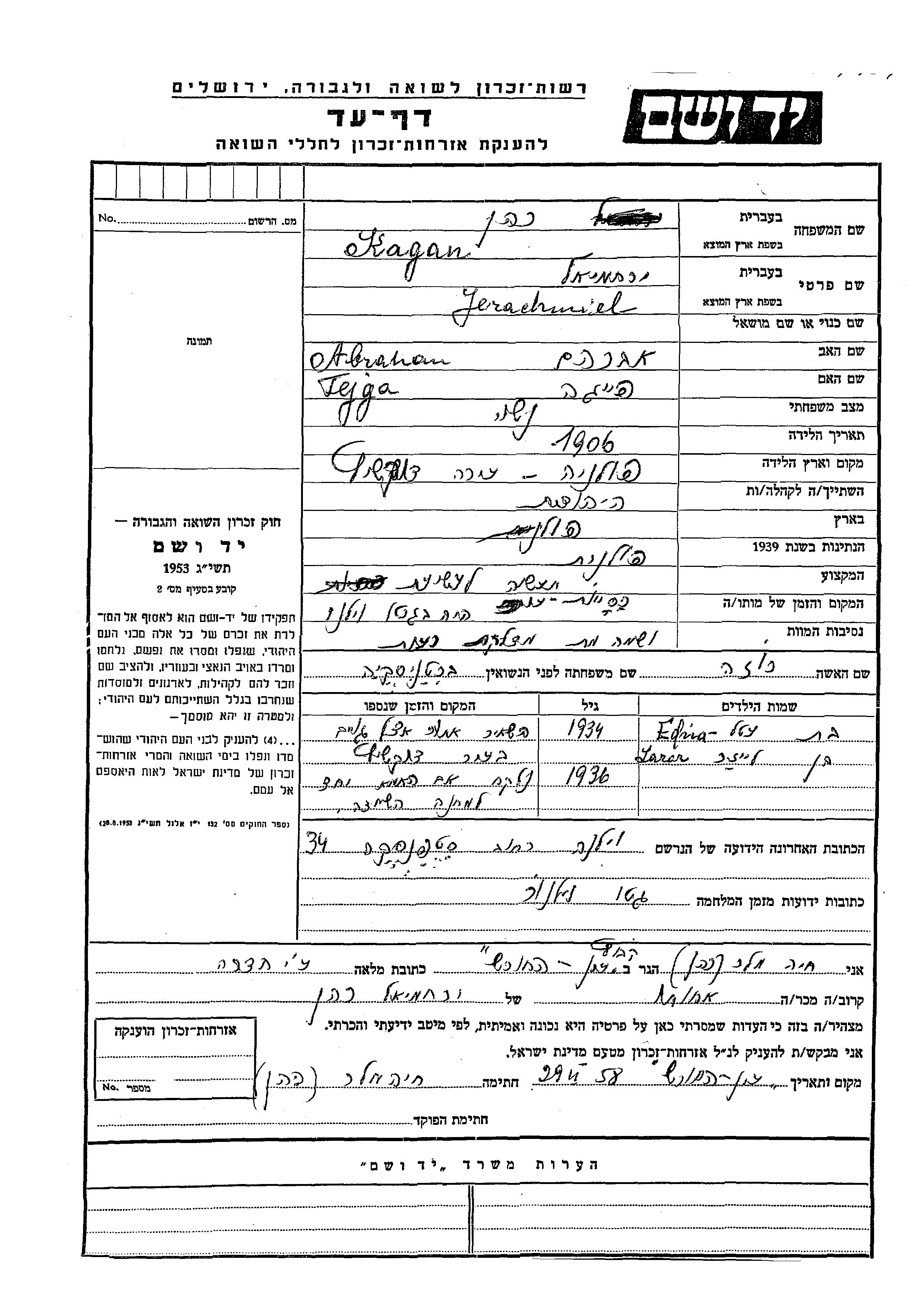 Yad Vashem - Pages of Testimony Names Memorial Collection