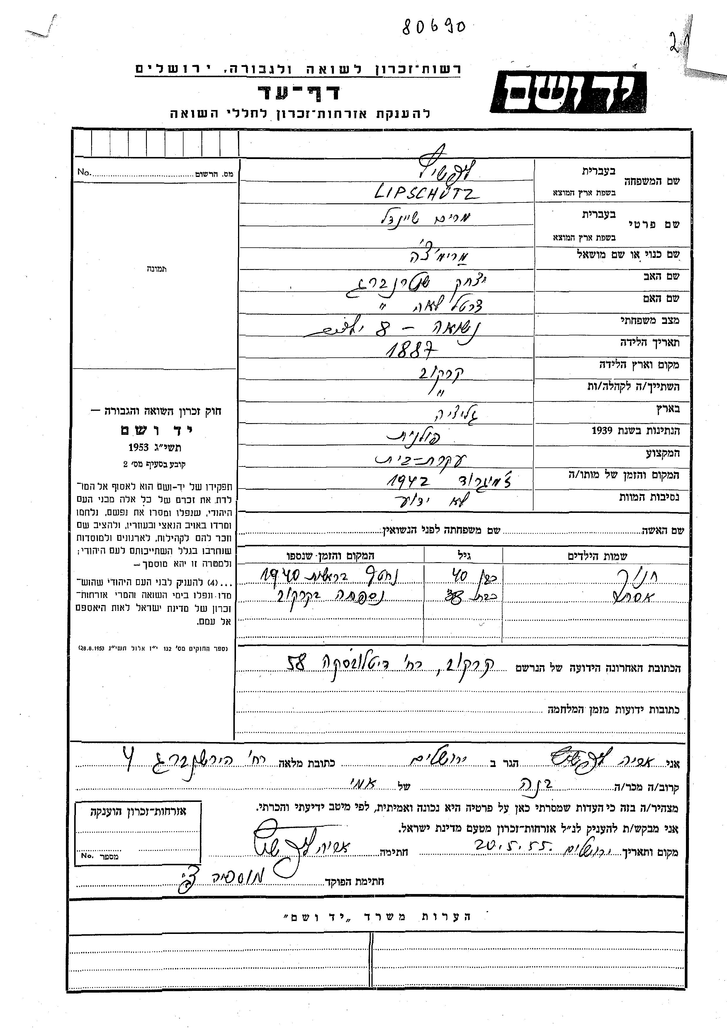 Lipschutz Khanokh endroit inconnu, Feuille de témoignage