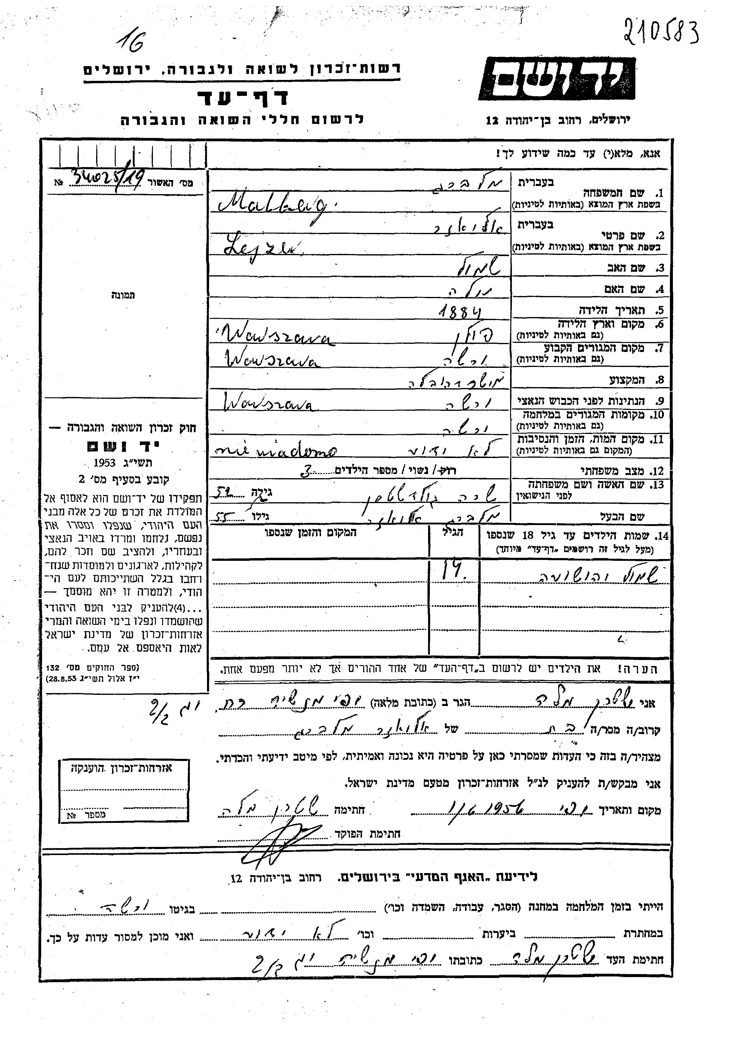 Malberg Melberg Shmul Yehoshua Warsaw, Pologne Feuille de témoignage