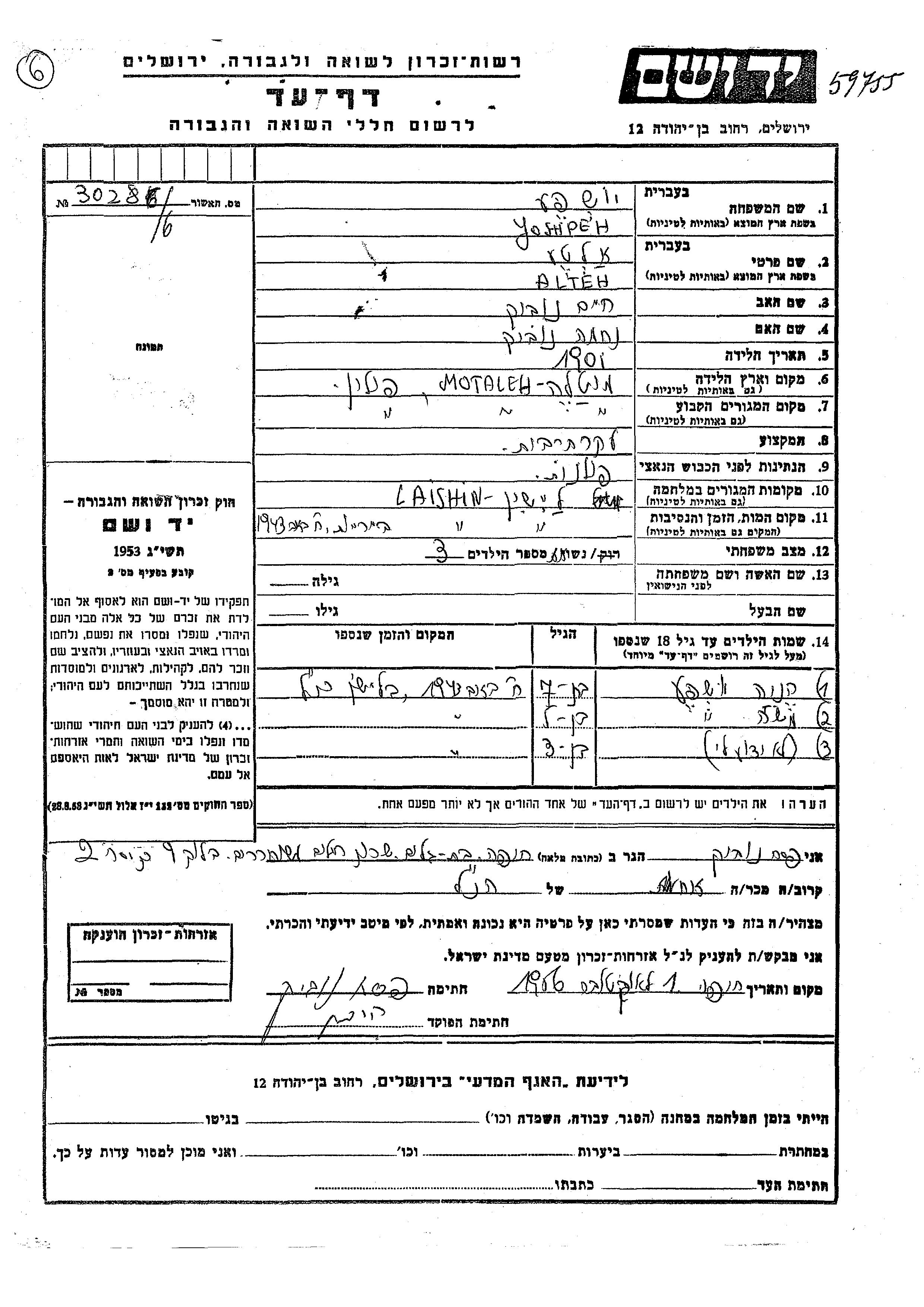 Moshe Yoshpeh est né fils de Alteh née Novik. Il était Enfant. Avant la seconde guerre mondiale il vivait à Motal, Pologne. Au cours de la guerre, il était à Lahiszyn, Pologne.