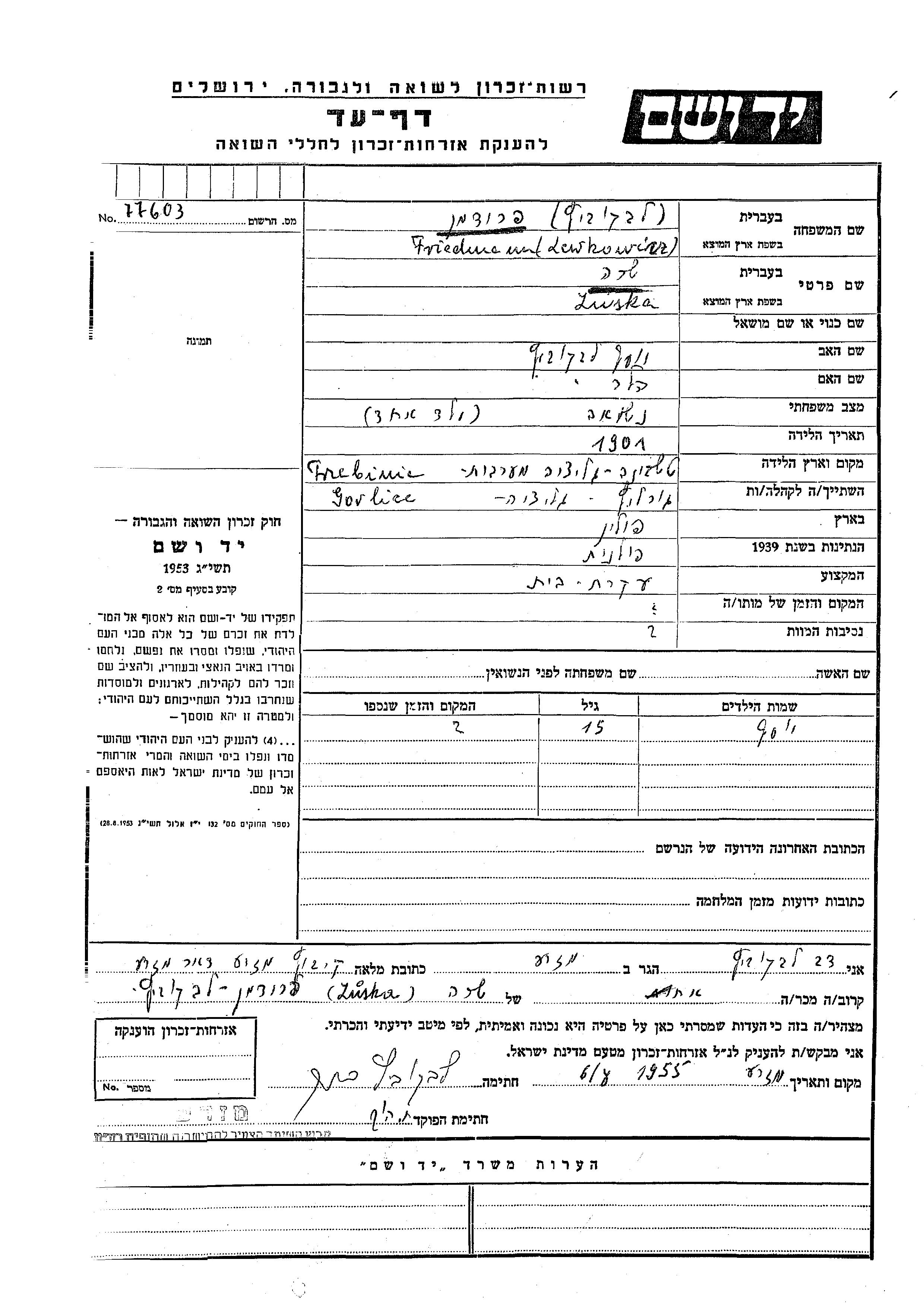 Friedmann Yosef Gorlice, Pologne Feuille de témoignage