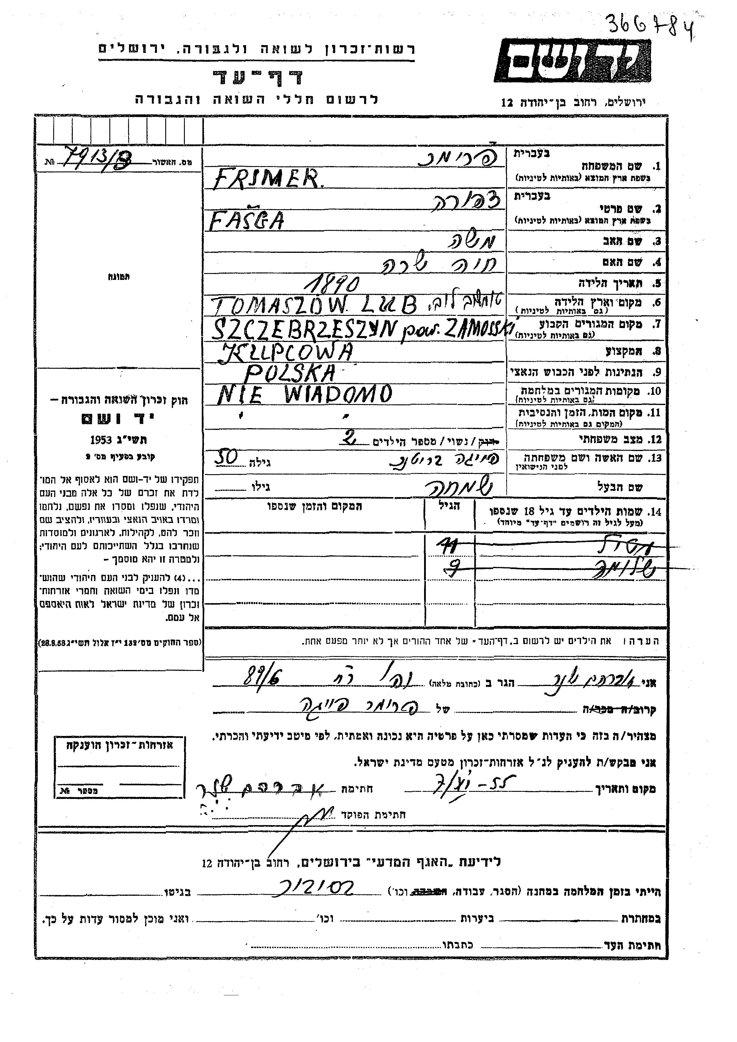 Frimer Shlomo Szczebrzeszyn, Pologne Feuille de témoignage