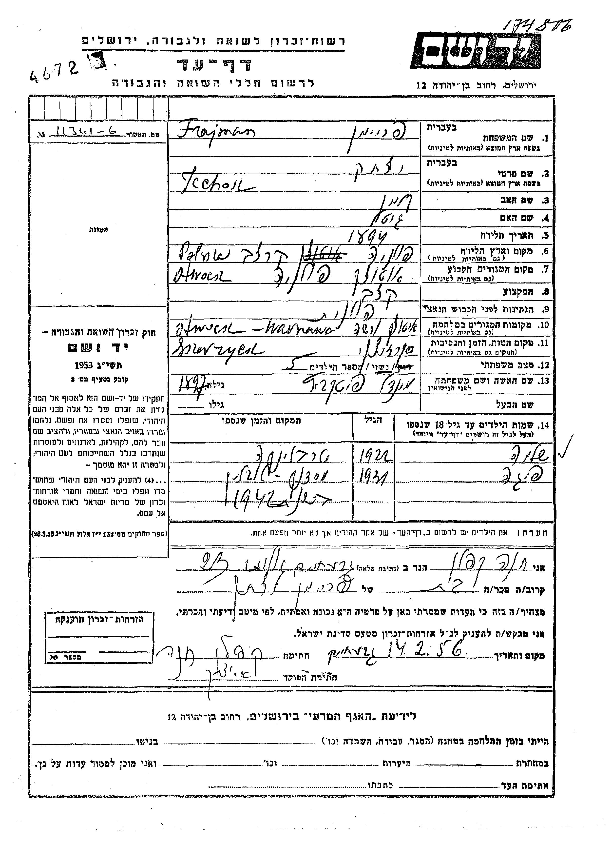 Yad Vashem - Pages of Testimony Names Memorial Collection