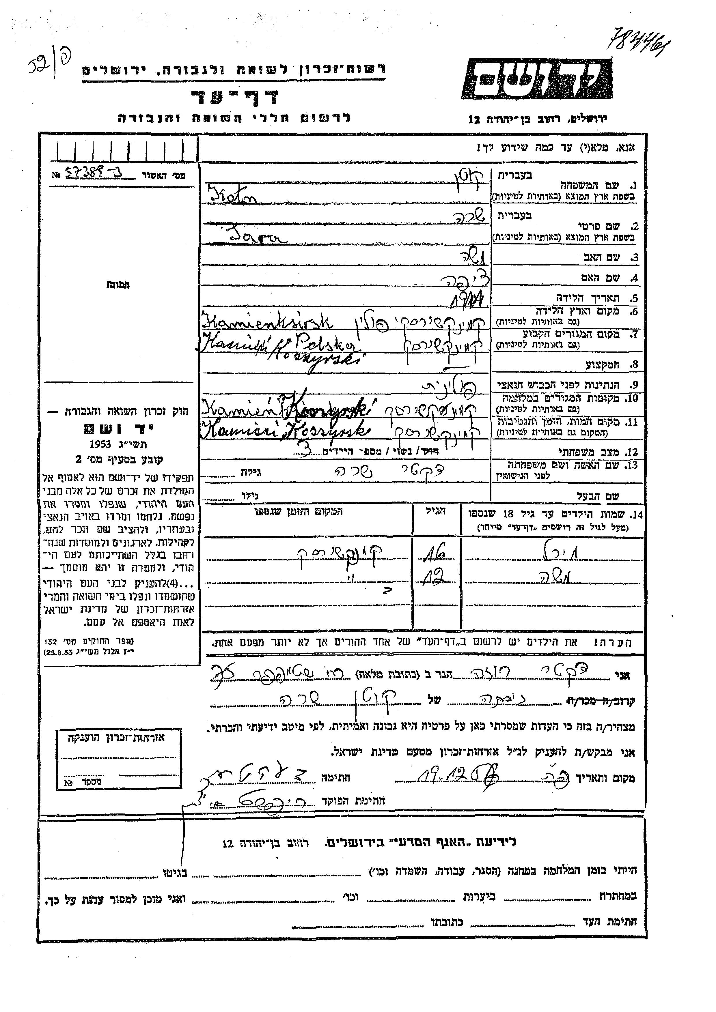 Koten Kuten Moshe Kamien Koszyrski, Pologne Feuille de témoignage