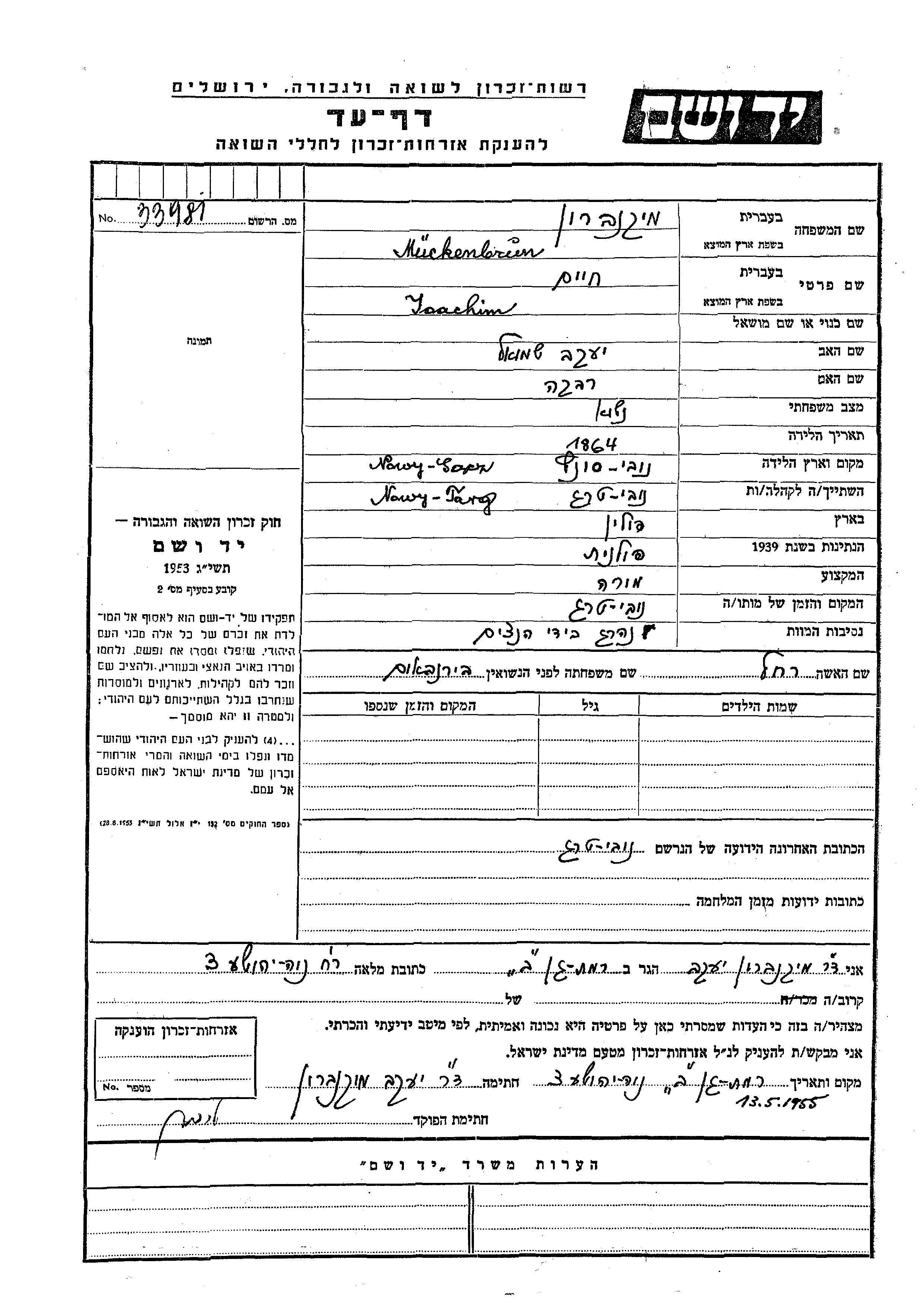Muckenbrun Joachim Khaim 1864 Nowy Targ, Pologne Feuille de témoignage