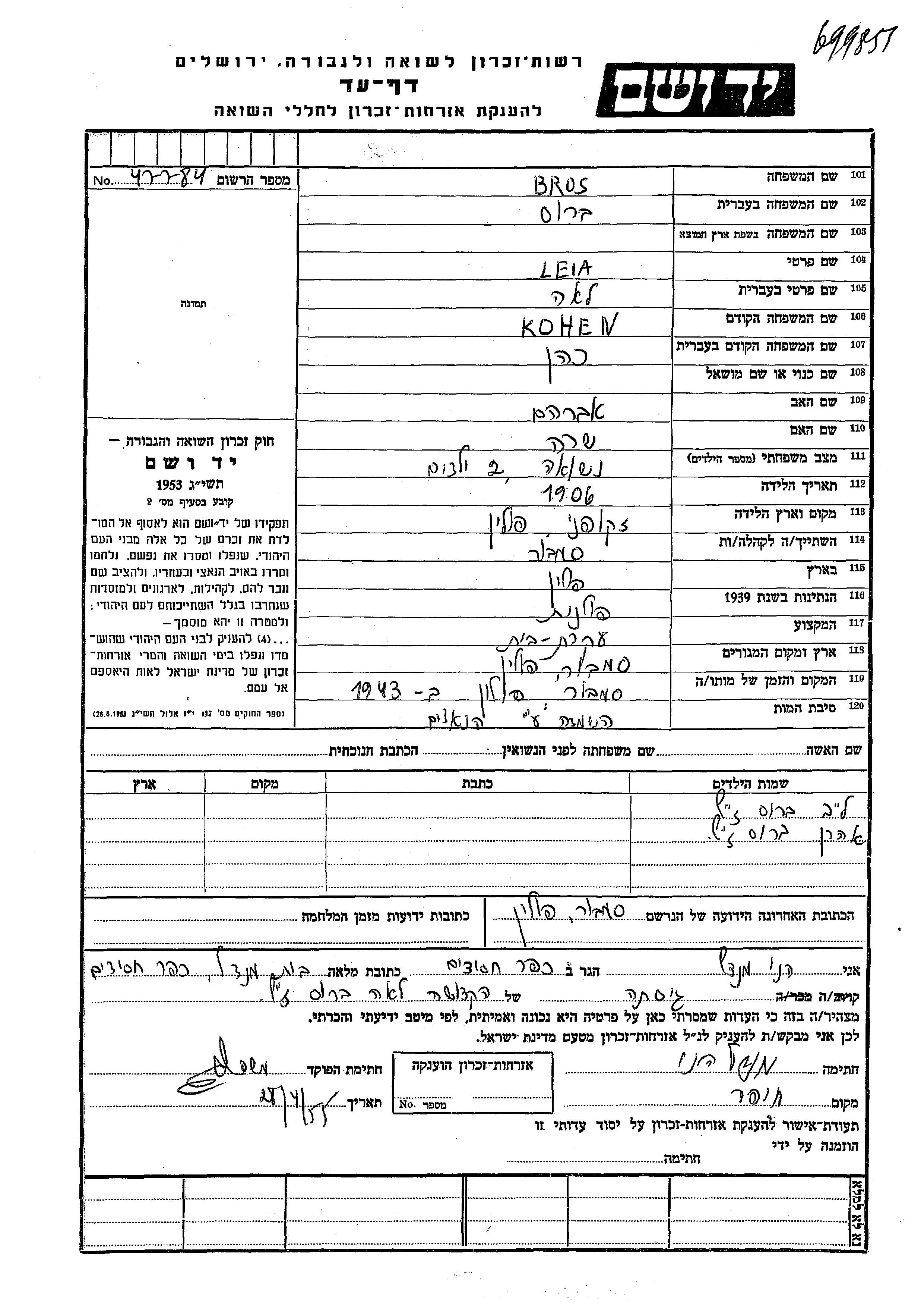 Bros Aharon Sambor, Pologne Feuille de témoignage