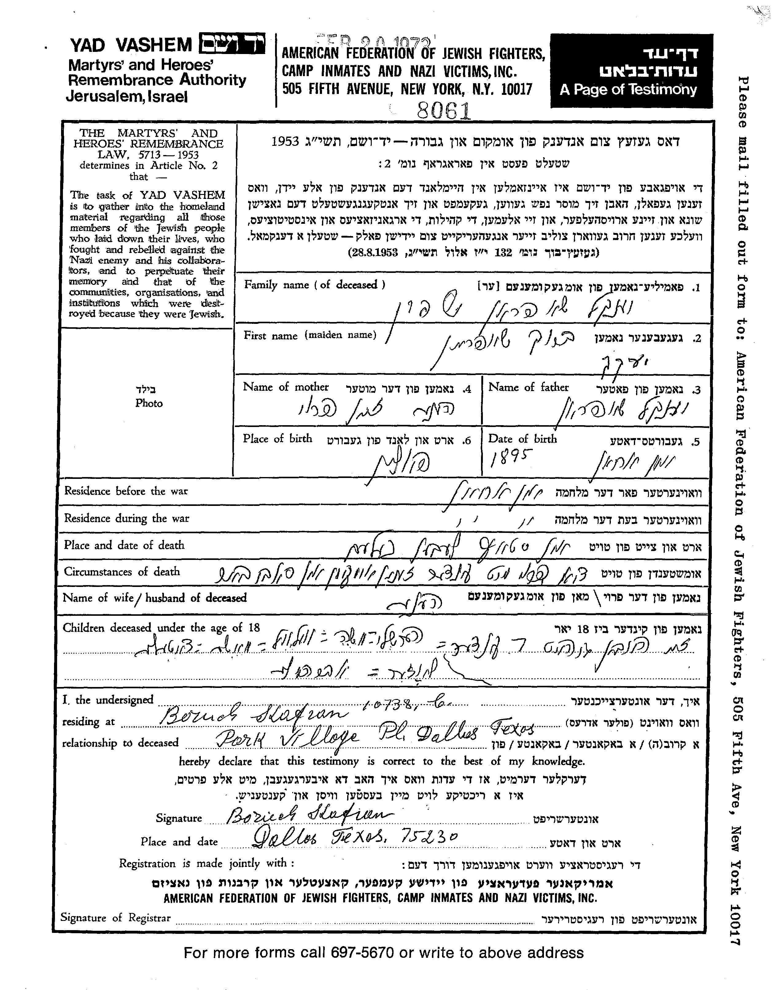Shafran Tzeitel endroit inconnu, Feuille de témoignage