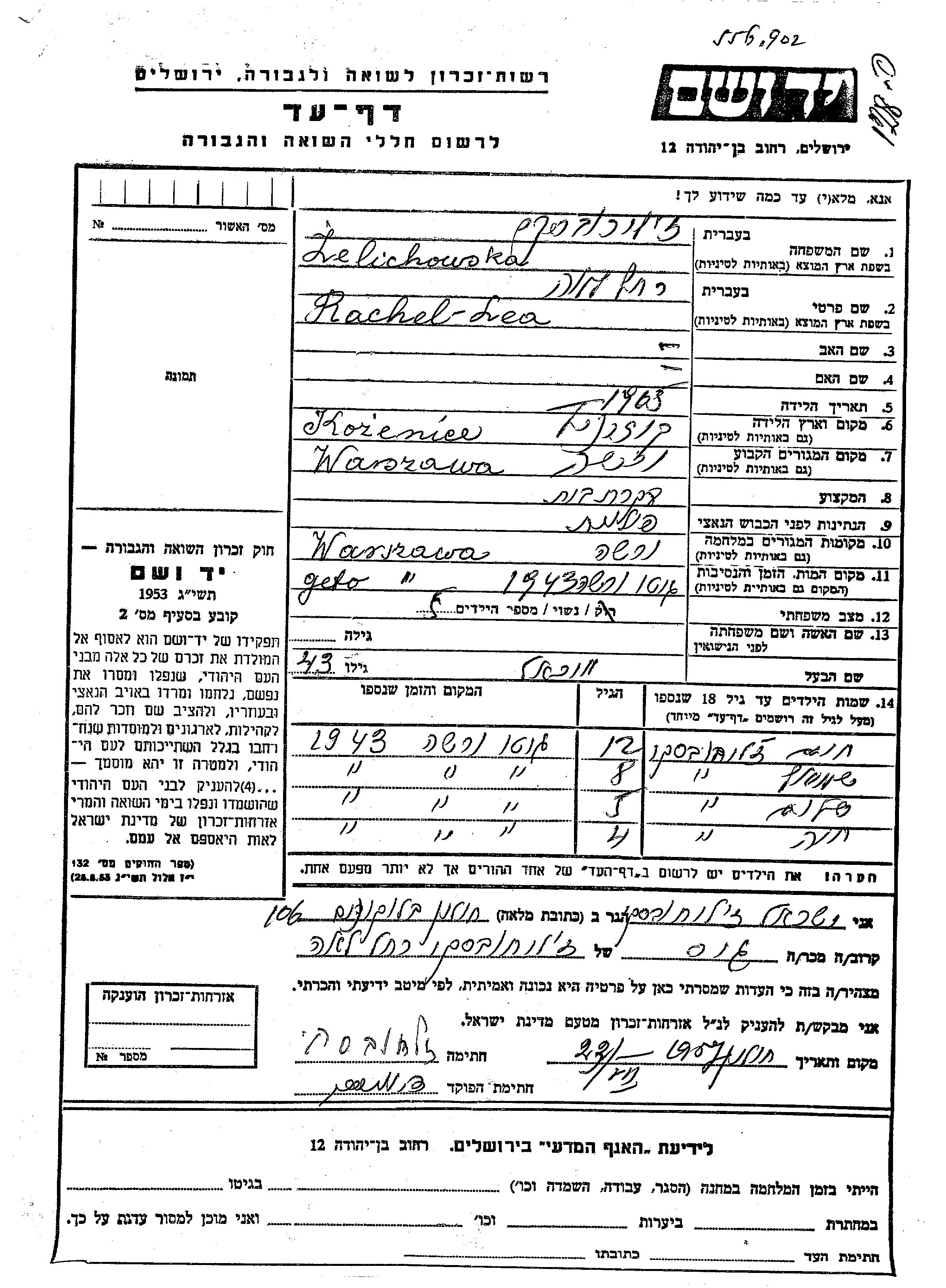 Zelichowski Shalom Warszawa, Pologne Feuille de témoignage
