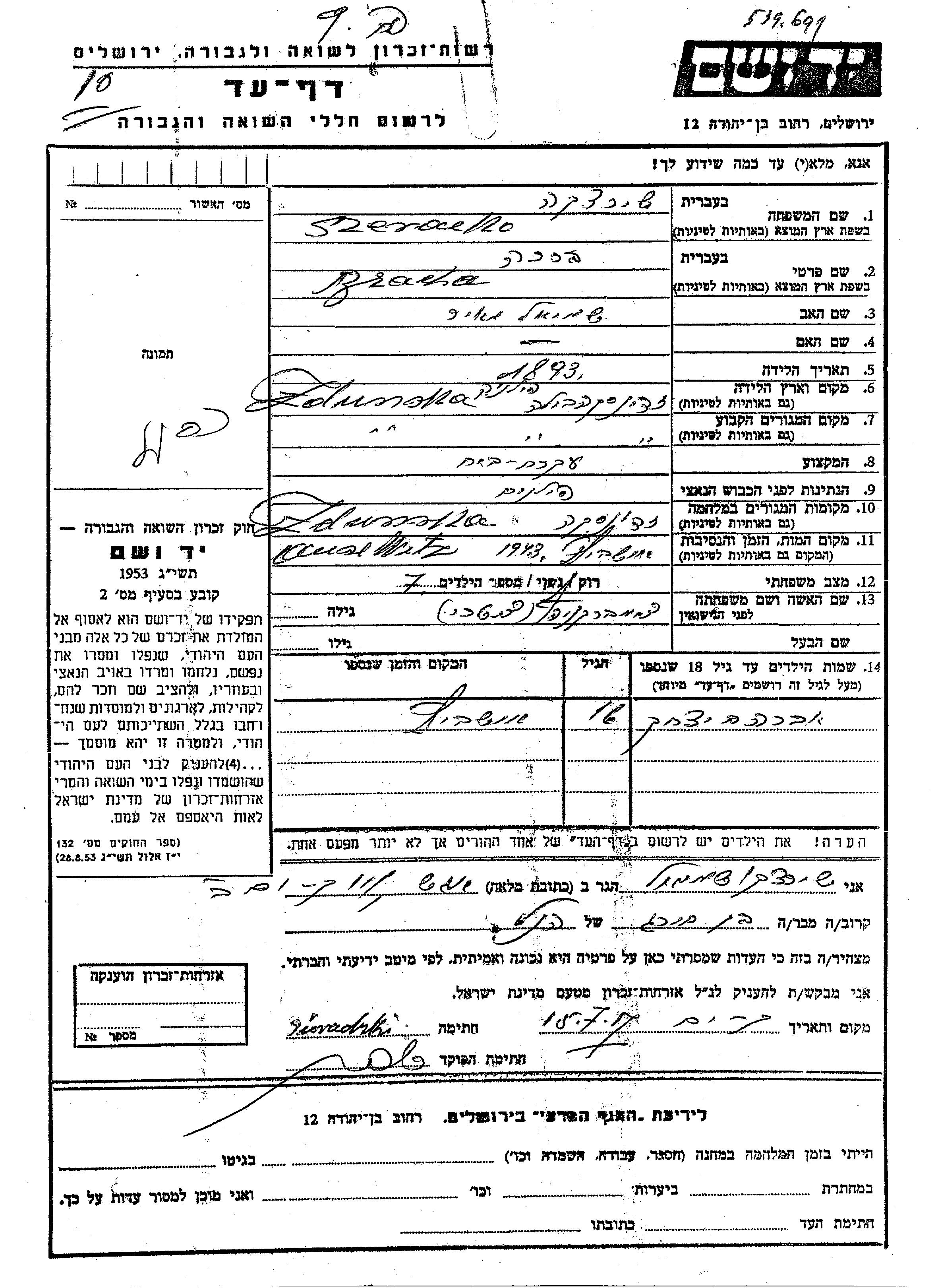 Szeracko Avraham Yitzkhak Zdunska Vola, Pologne Feuille de témoignage