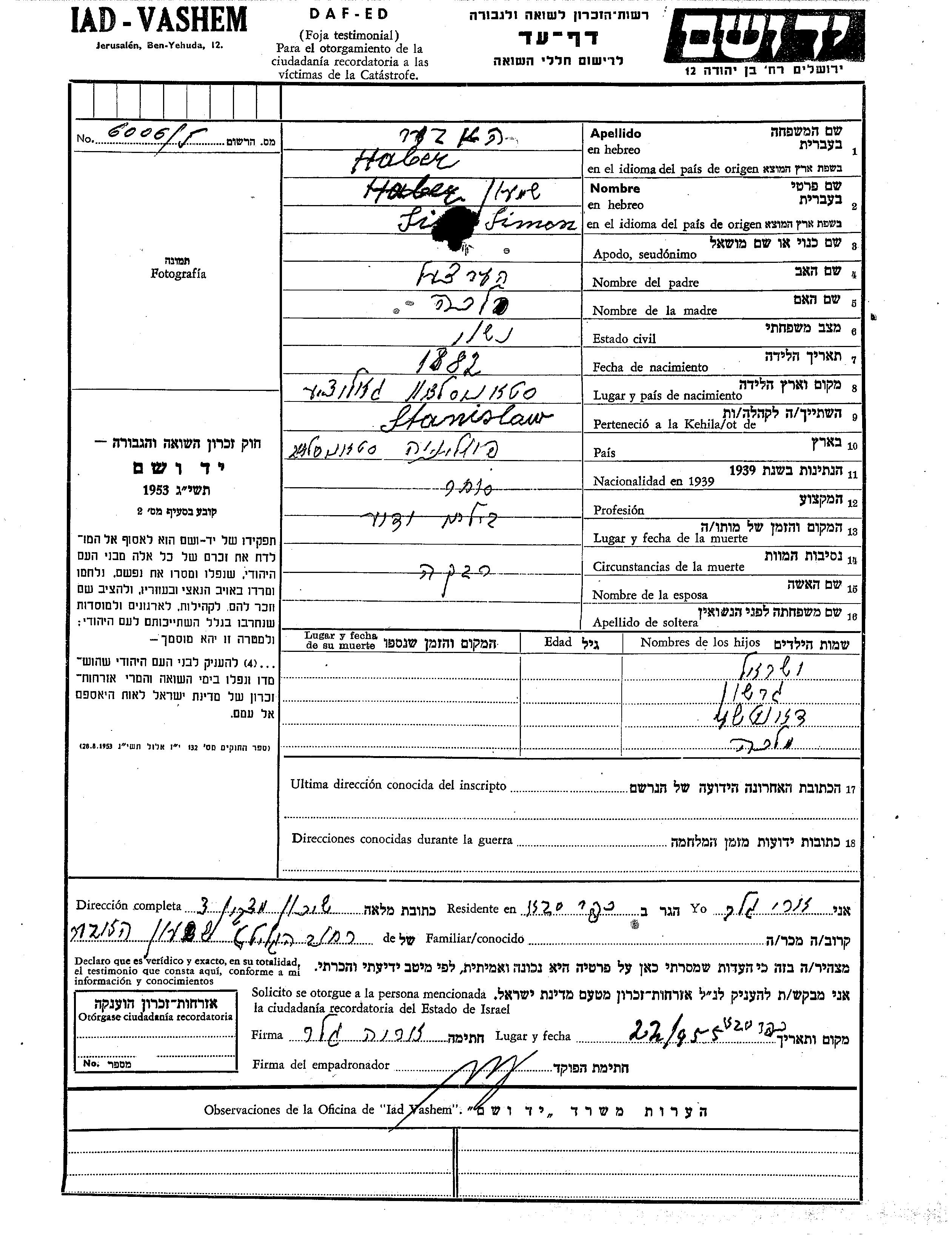 Haber Malka Stanislaw, Pologne Feuille de témoignage