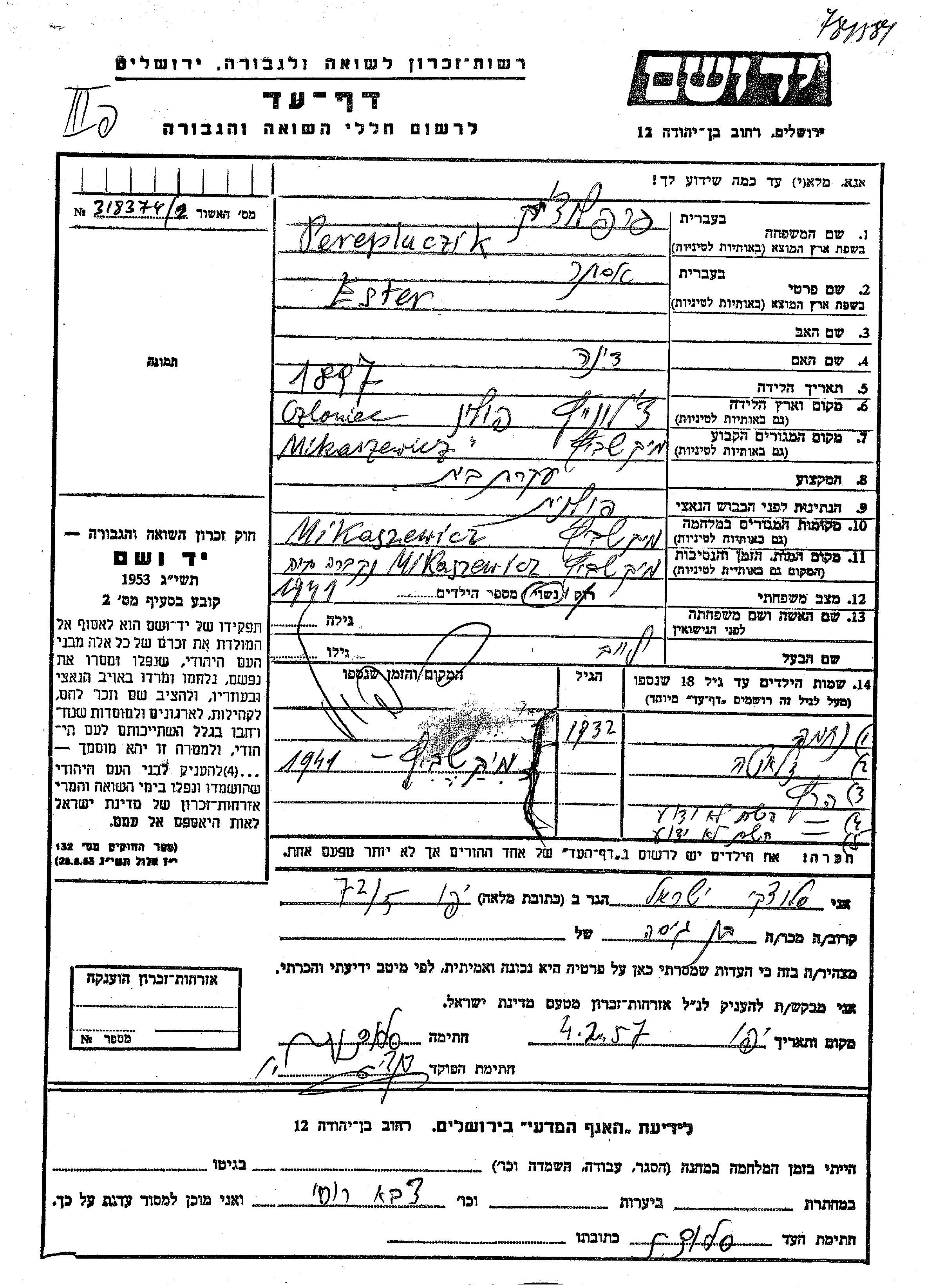 Hertz Pereploczyk est né fils de Leib et de Ester. Il était Enfant. Avant la seconde guerre mondiale il vivait à Mikaszewicze, Pologne. Au cours de la guerre, il était à Mikaszewicze, Pologne.