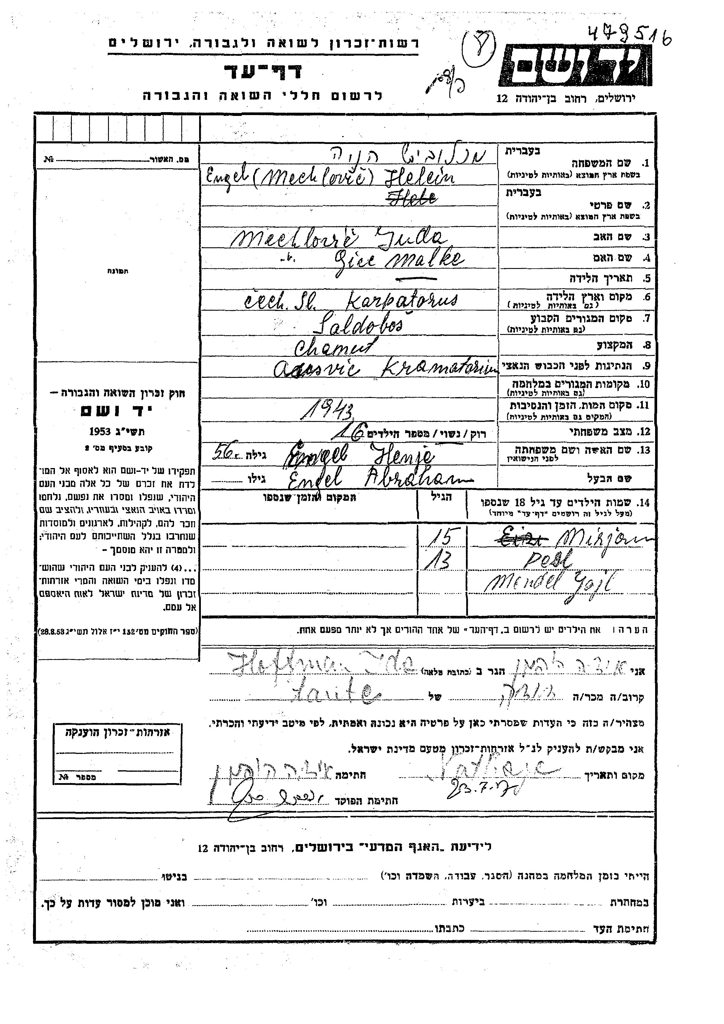 Yad Vashem - Pages of Testimony Names Memorial Collection