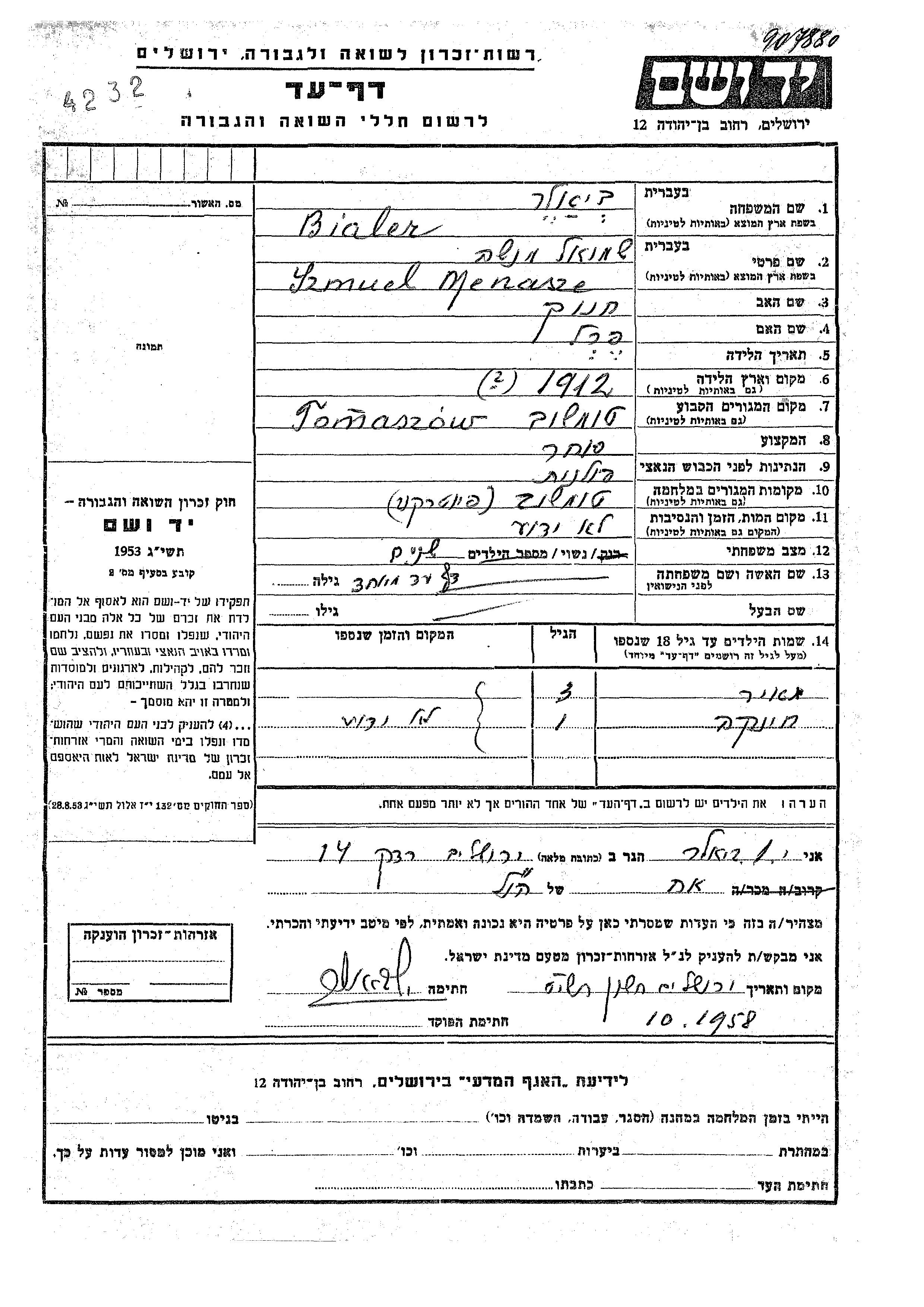 Bialer Khinka Tomaszow, Pologne Feuille de témoignage