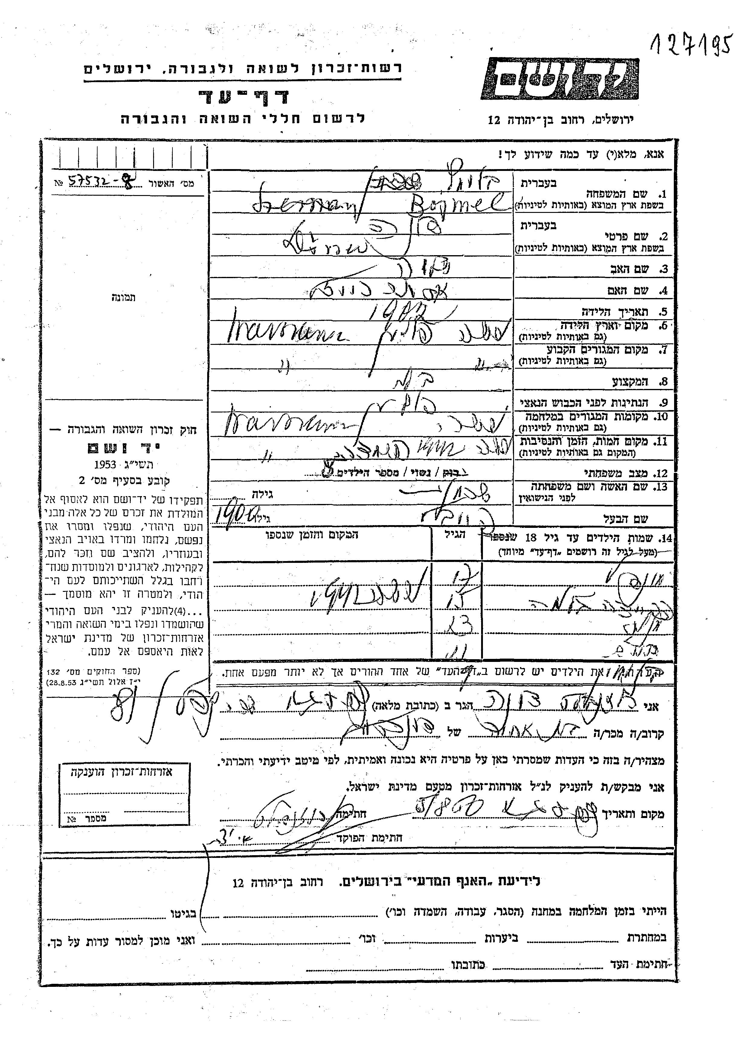 Bojmel Mania Warsaw, Pologne Feuille de témoignage