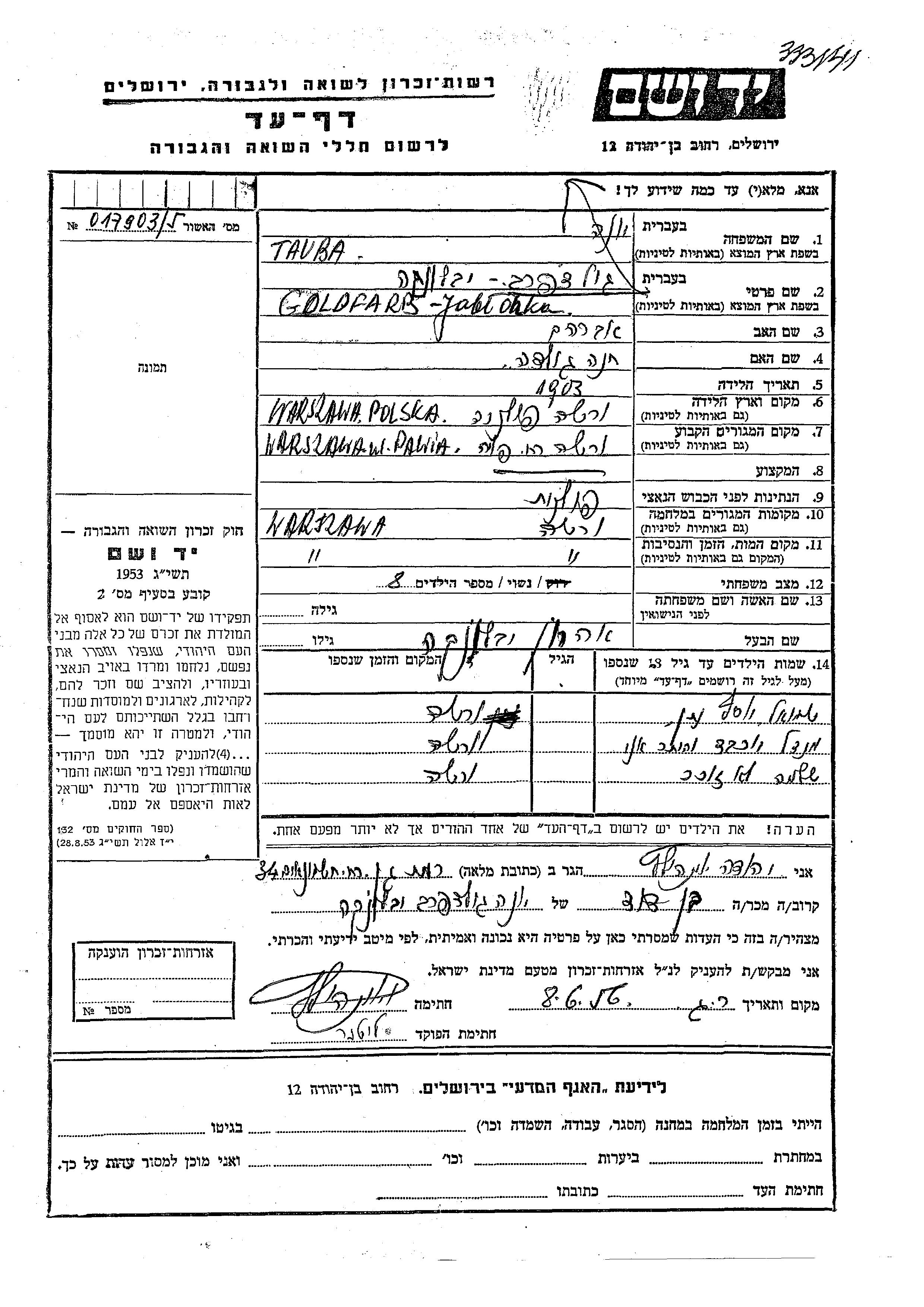 Jablonka Goldfarb Natan Warsaw, Pologne Feuille de témoignage