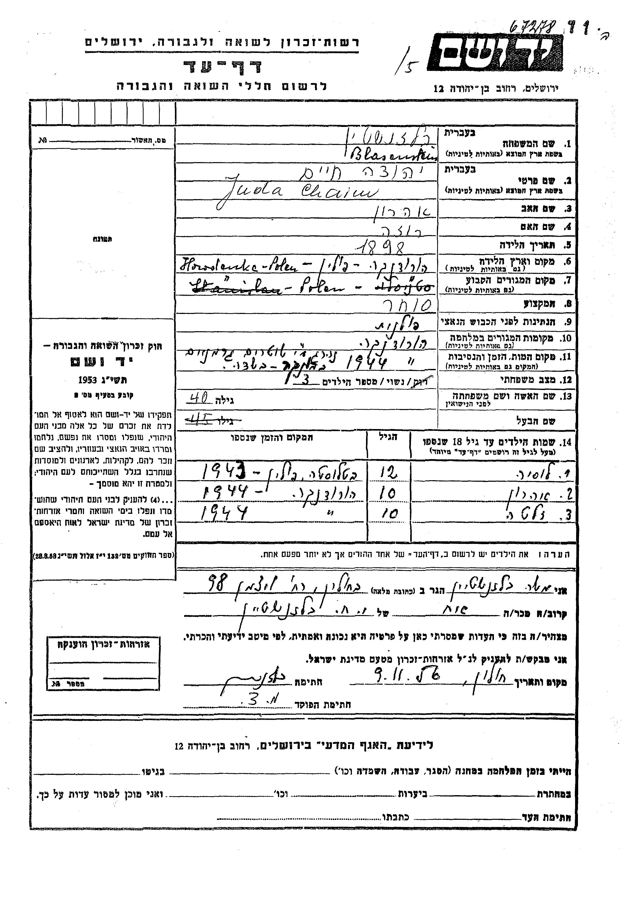 Yad Vashem - Pages of Testimony Names Memorial Collection