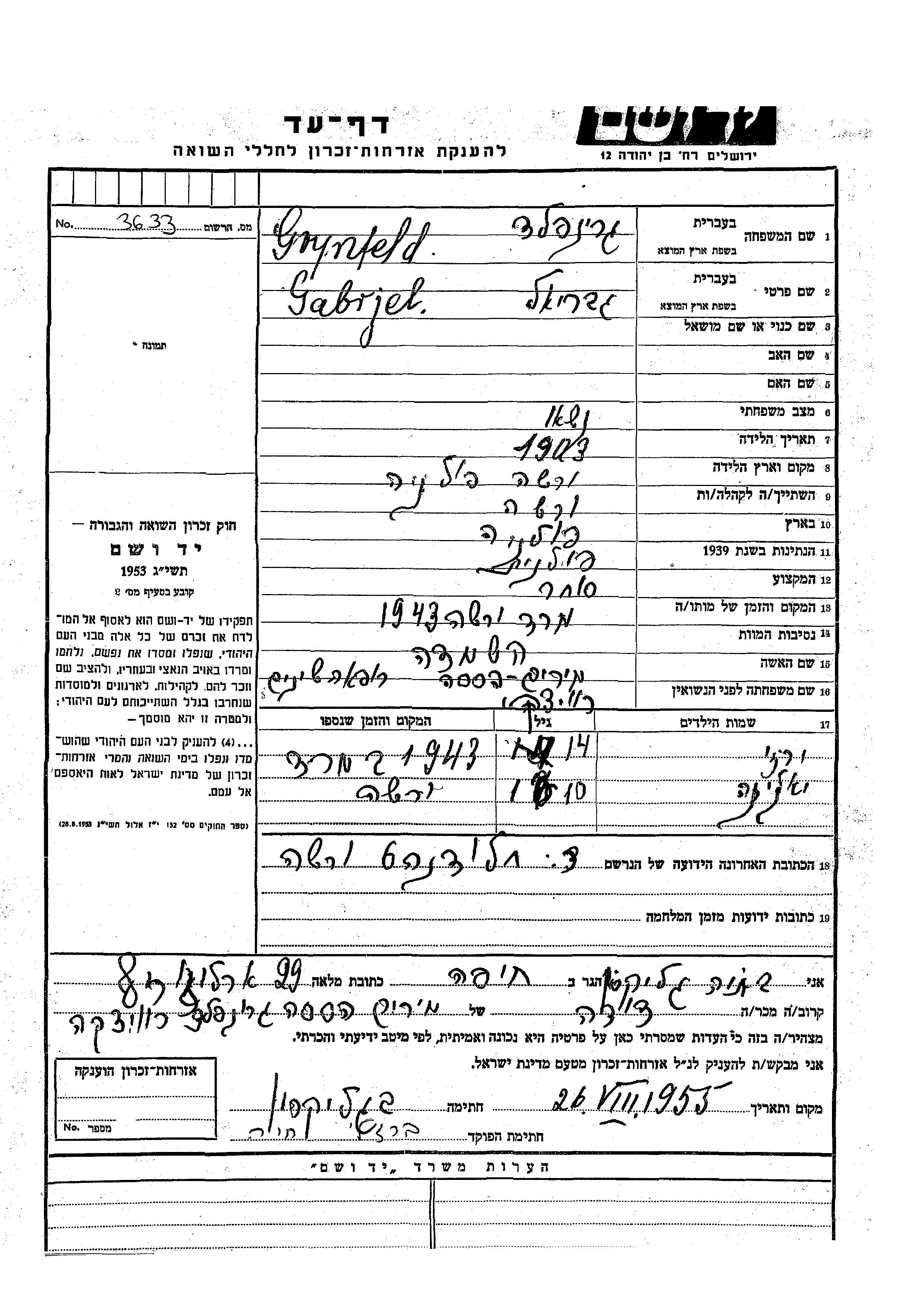 Grynfeld prénom inconnu endroit inconnu, Feuille de témoignage