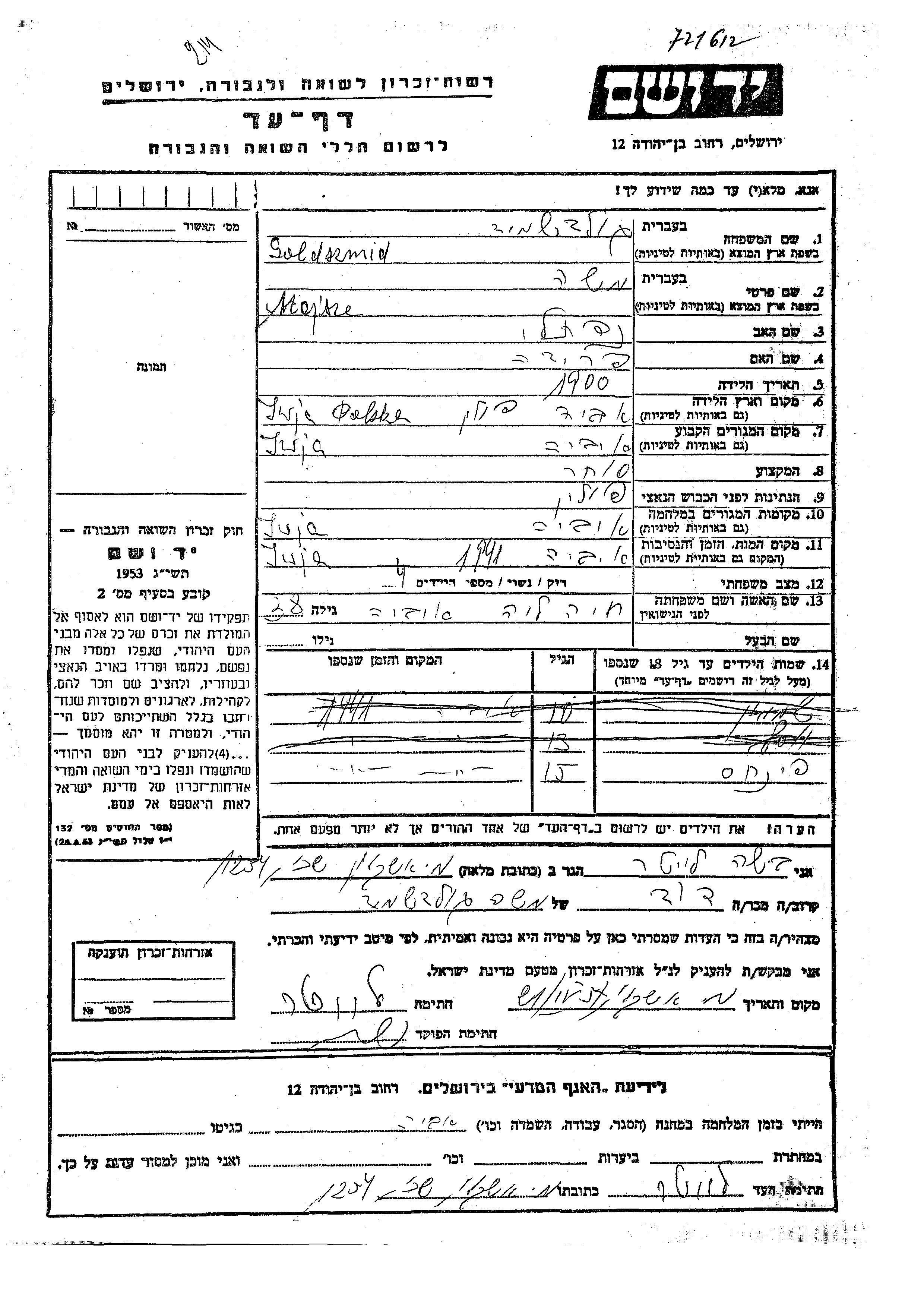 Goldszmid Yosef Iwja, Pologne Feuille de témoignage