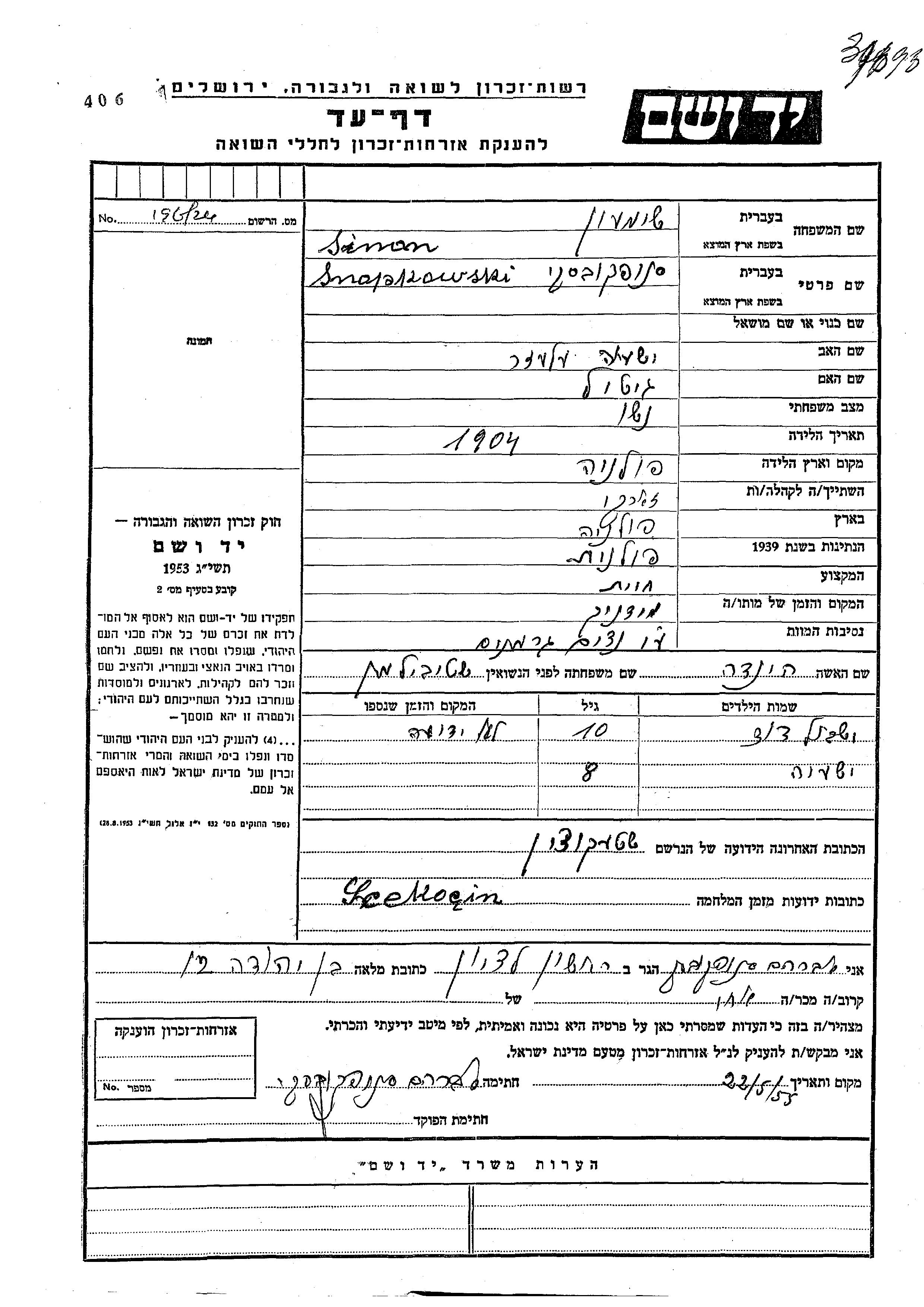 Snopkowski Yeshiyah Zarki, Pologne Feuille de témoignage