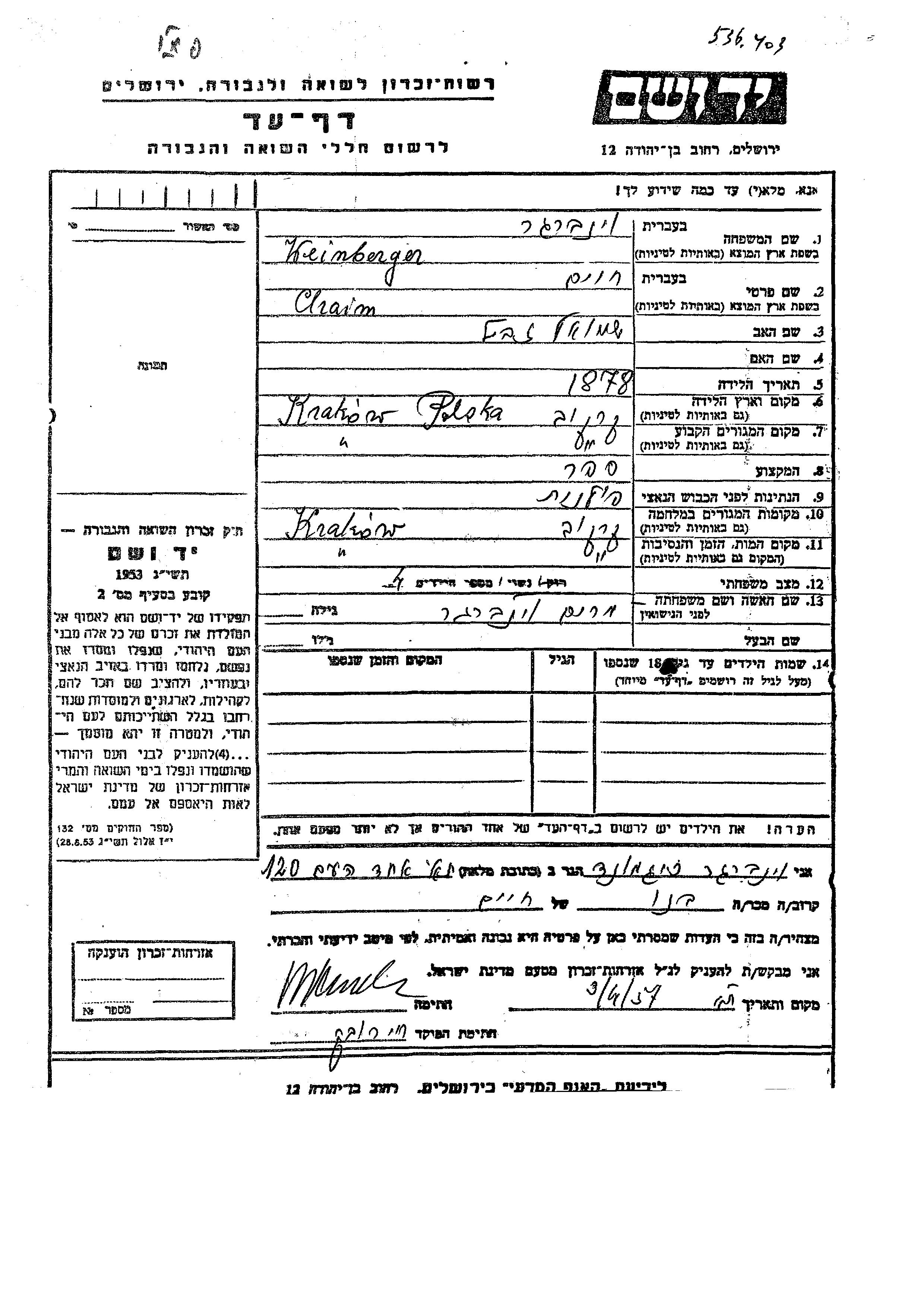 Weinberger Chaim 1878 Krakow, Pologne Feuille de témoignage