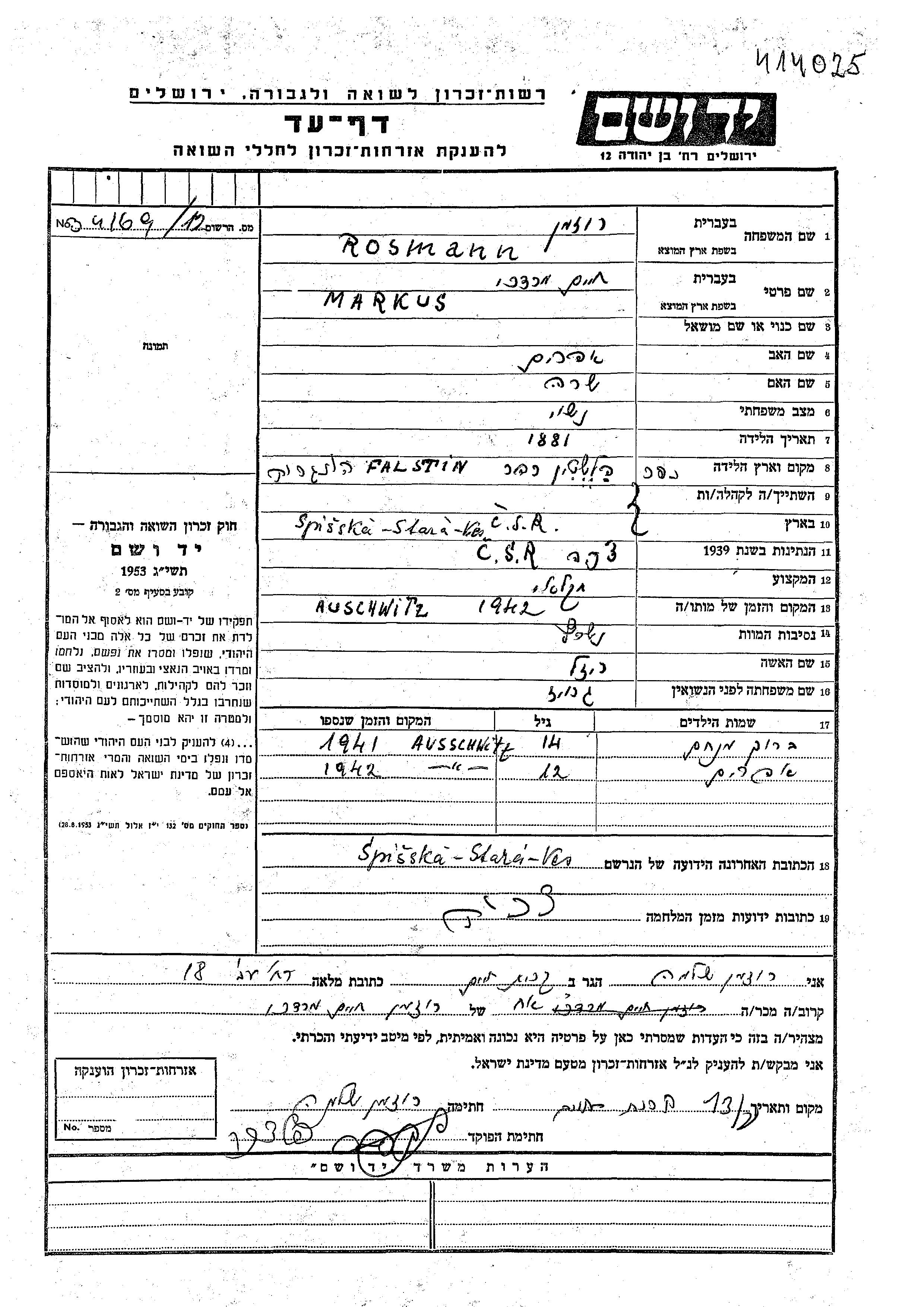 Rosmann Rozman Efraim Spisska Stara Ves, Tchécoslovaquie Feuille de témoignage