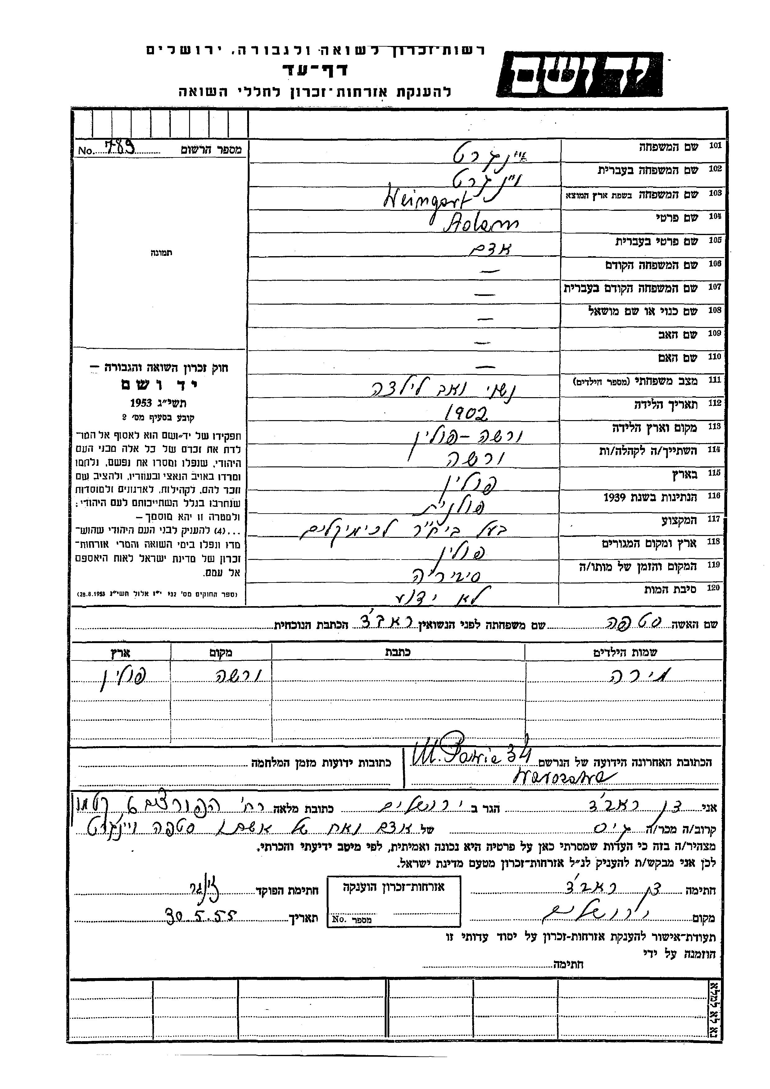 Yad Vashem - Pages of Testimony Names Memorial Collection