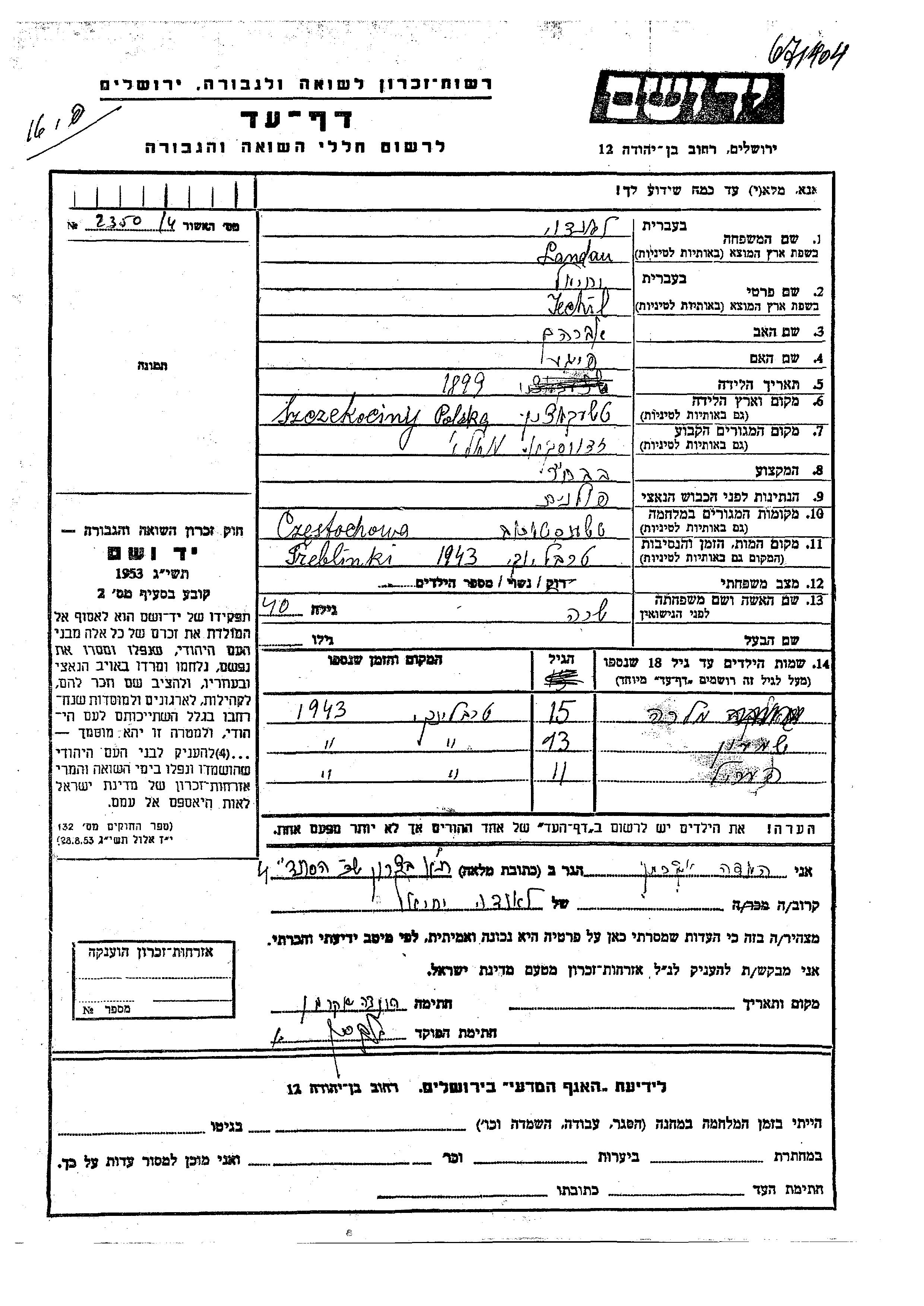 Landa Landau Peril Zdunska Wola, Pologne Feuille de témoignage