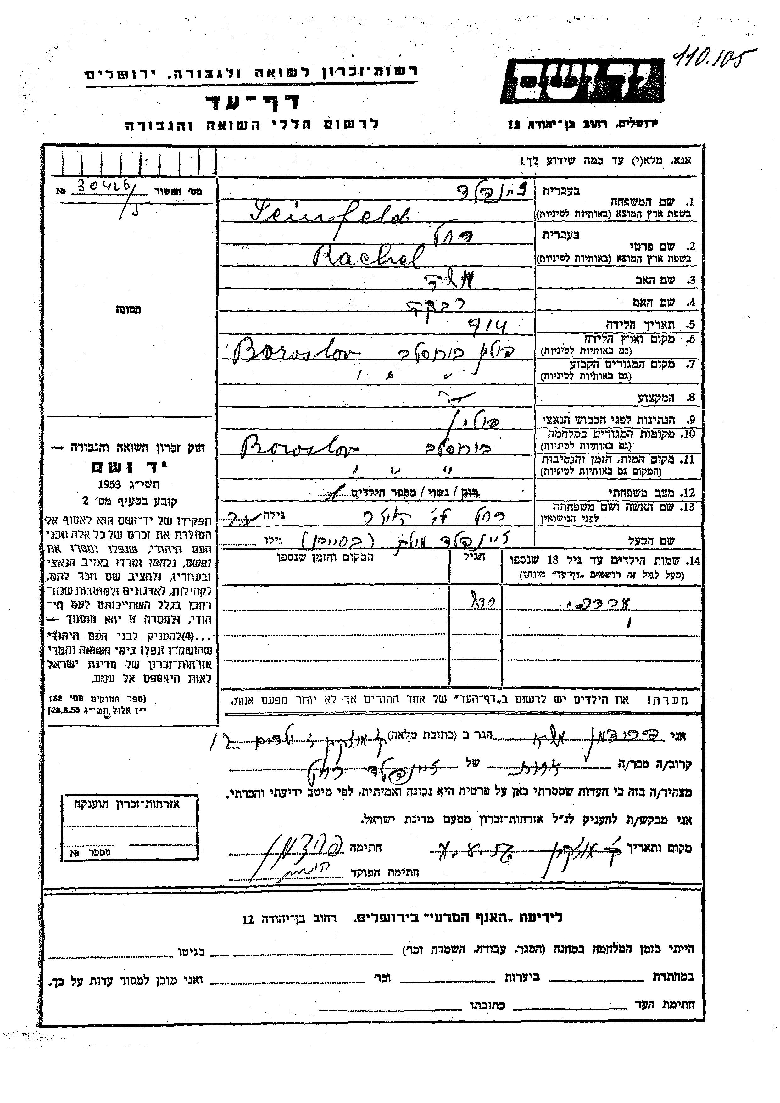 Zeinfeld Mordekhai Borislaw, Pologne Feuille de témoignage
