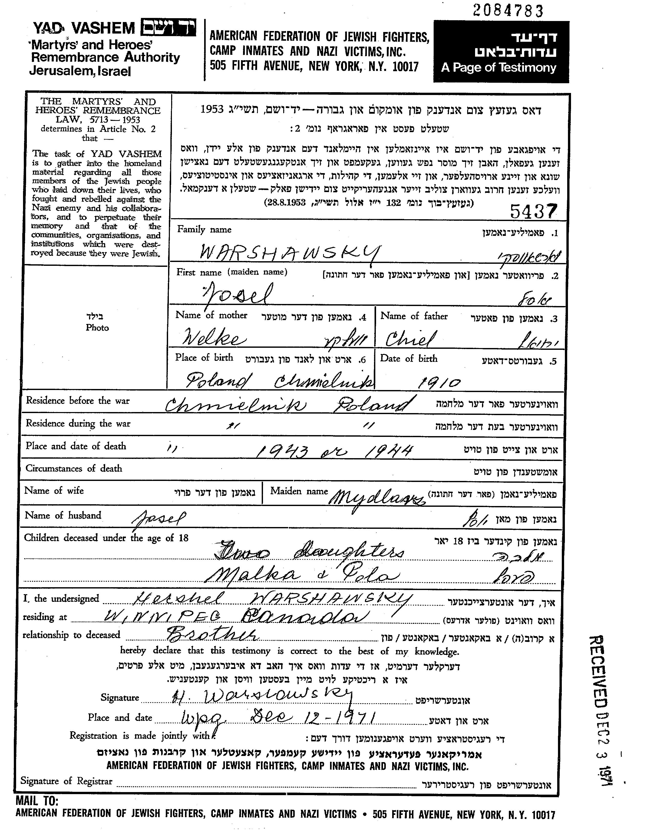 Warshawsky Malka Chmielni, Pologne Feuille de témoignage