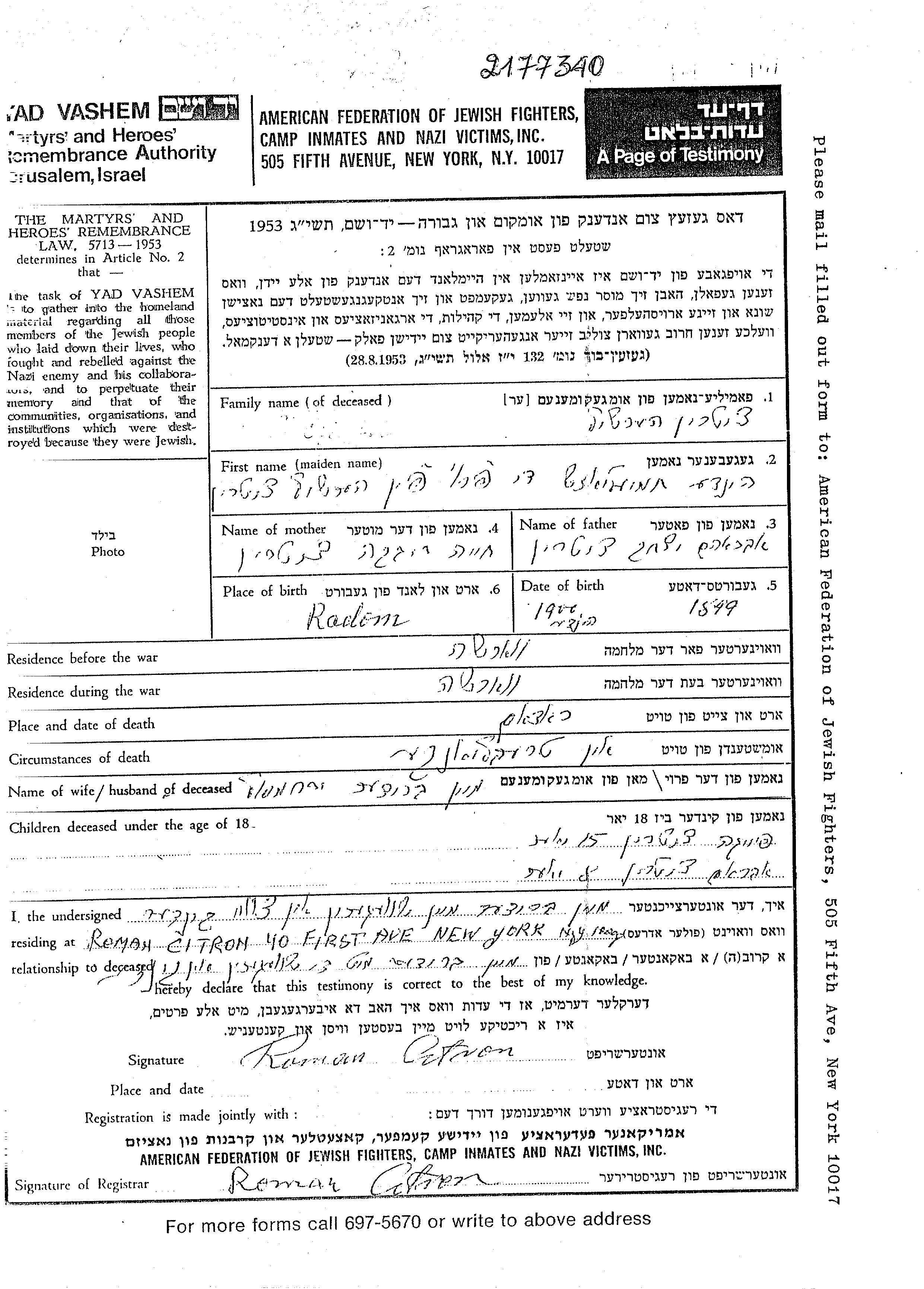 Yad Vashem - Pages of Testimony Names Memorial Collection