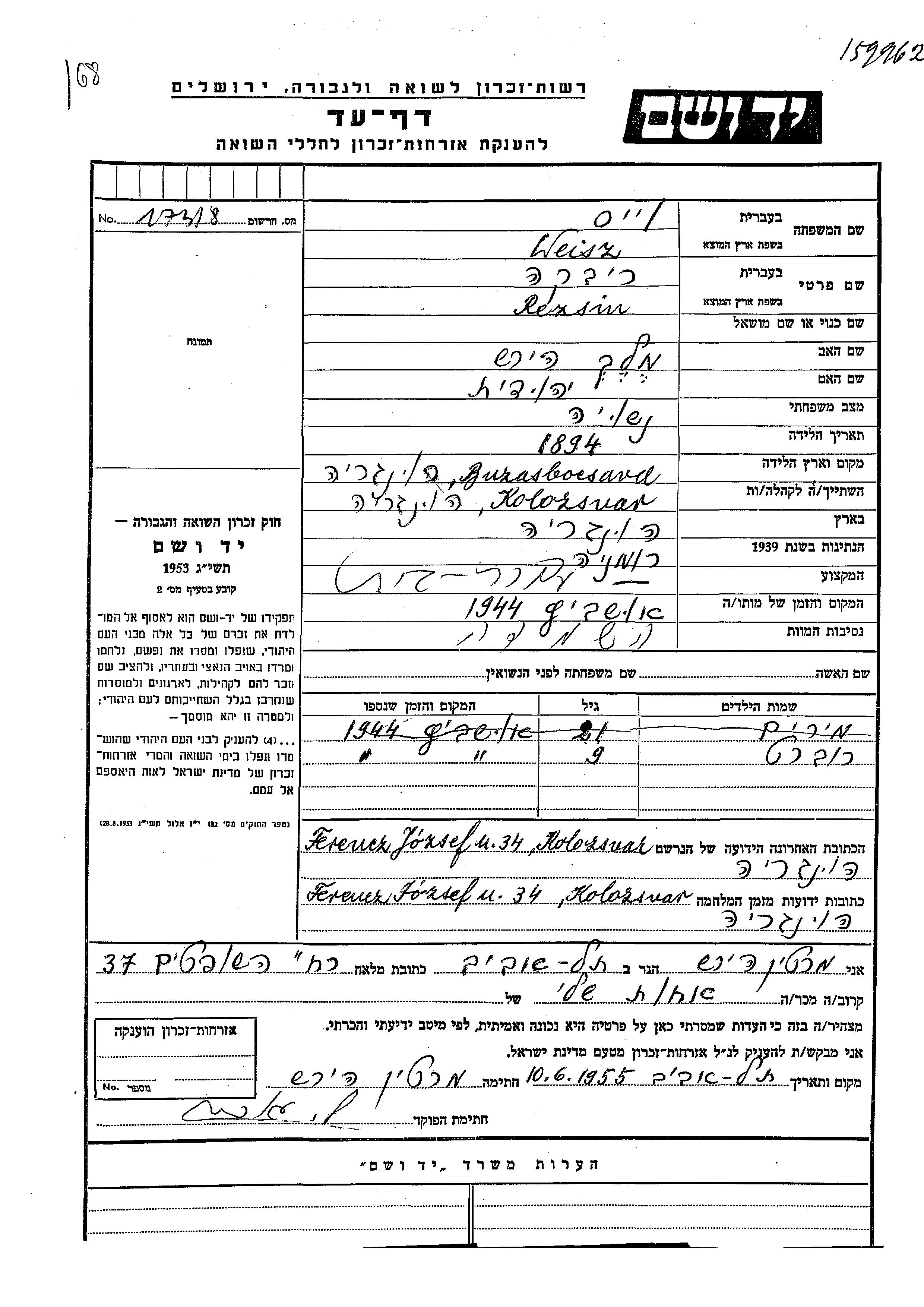 Weisz Rezsin Rivka 1894 Kolozhvar, Roumanie Feuille de témoignage