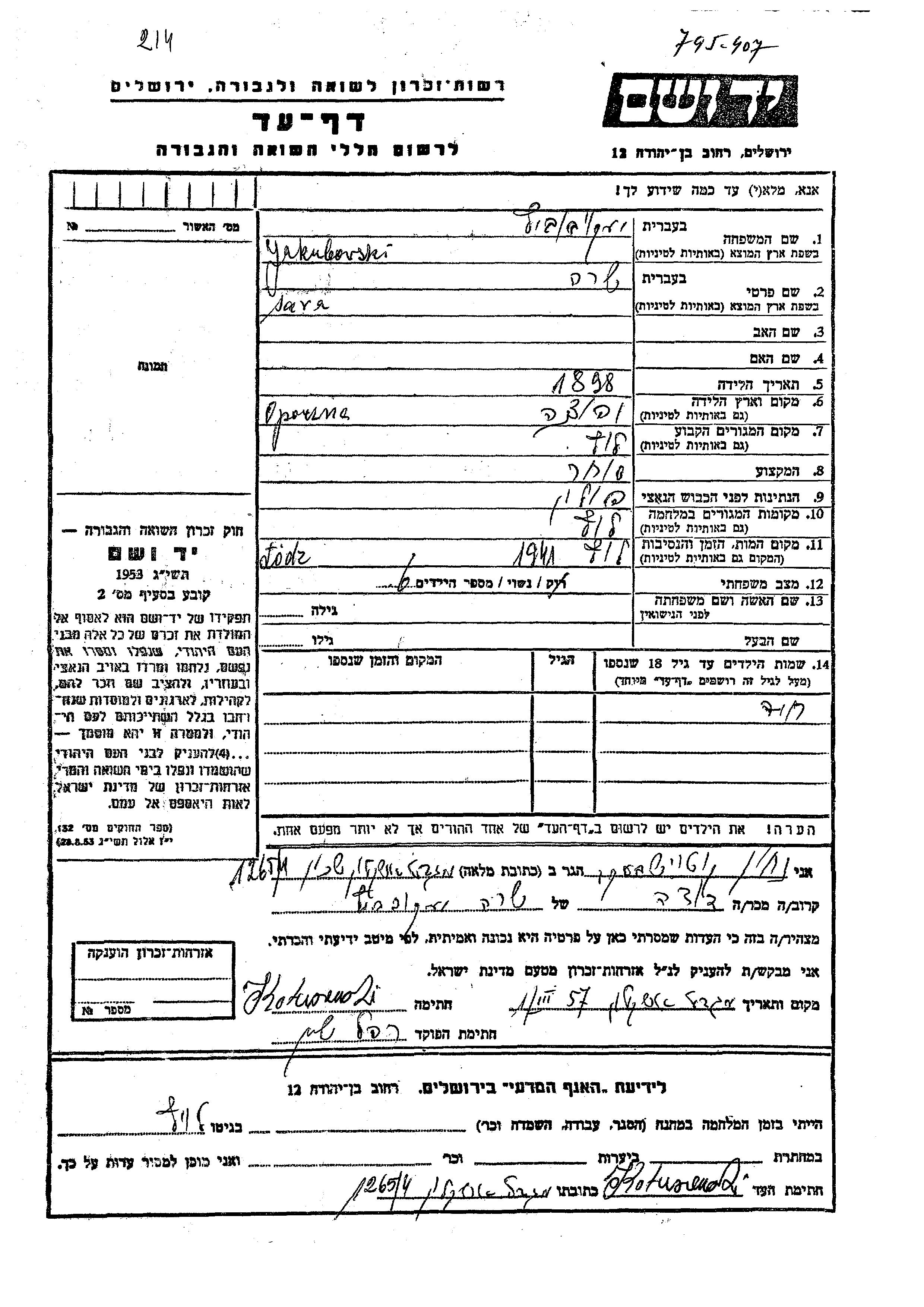 Yakubovski Yakubovitz Khaia Lodz, Pologne Feuille de témoignage