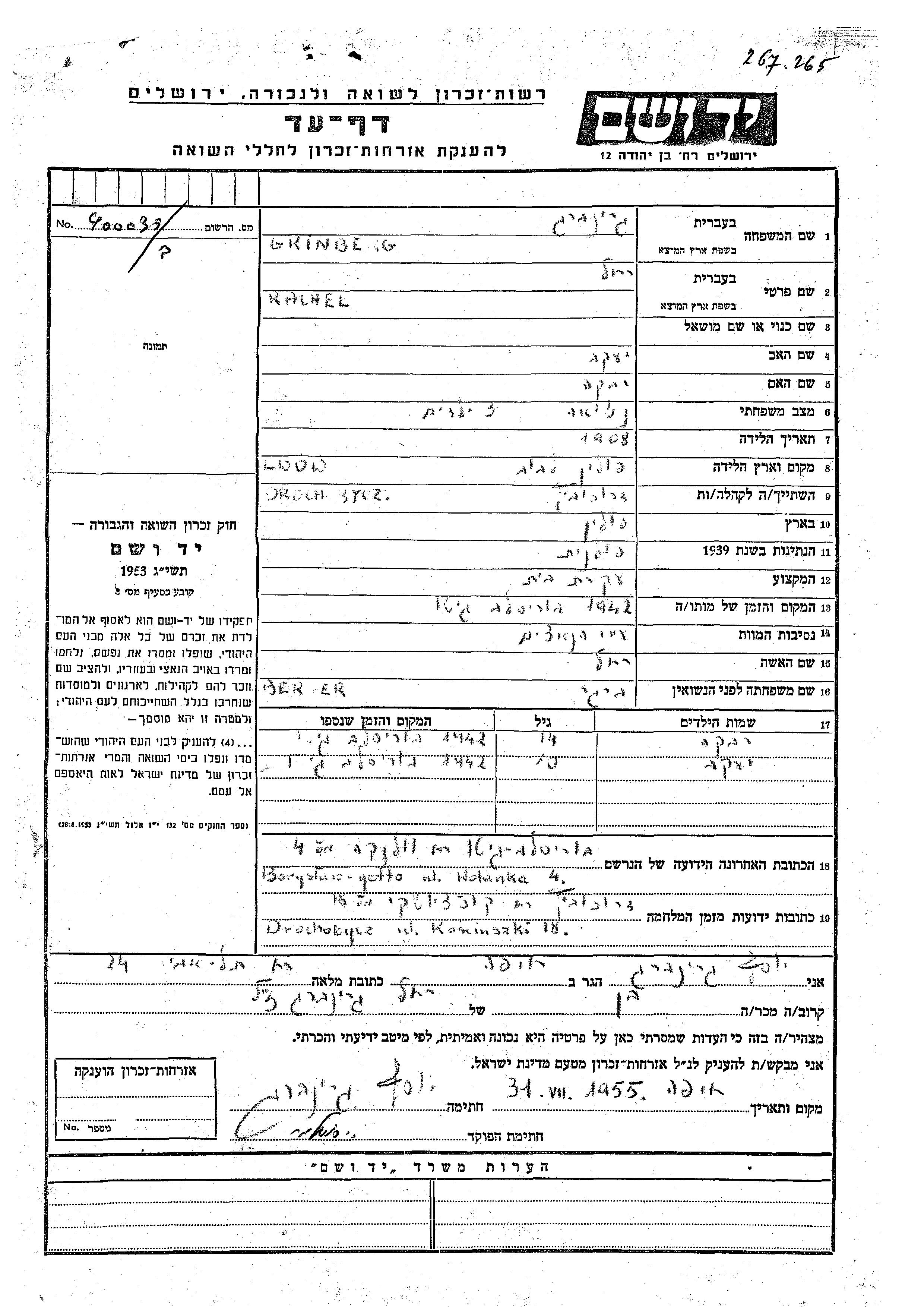 Grinberg Rivka endroit inconnu, Feuille de témoignage