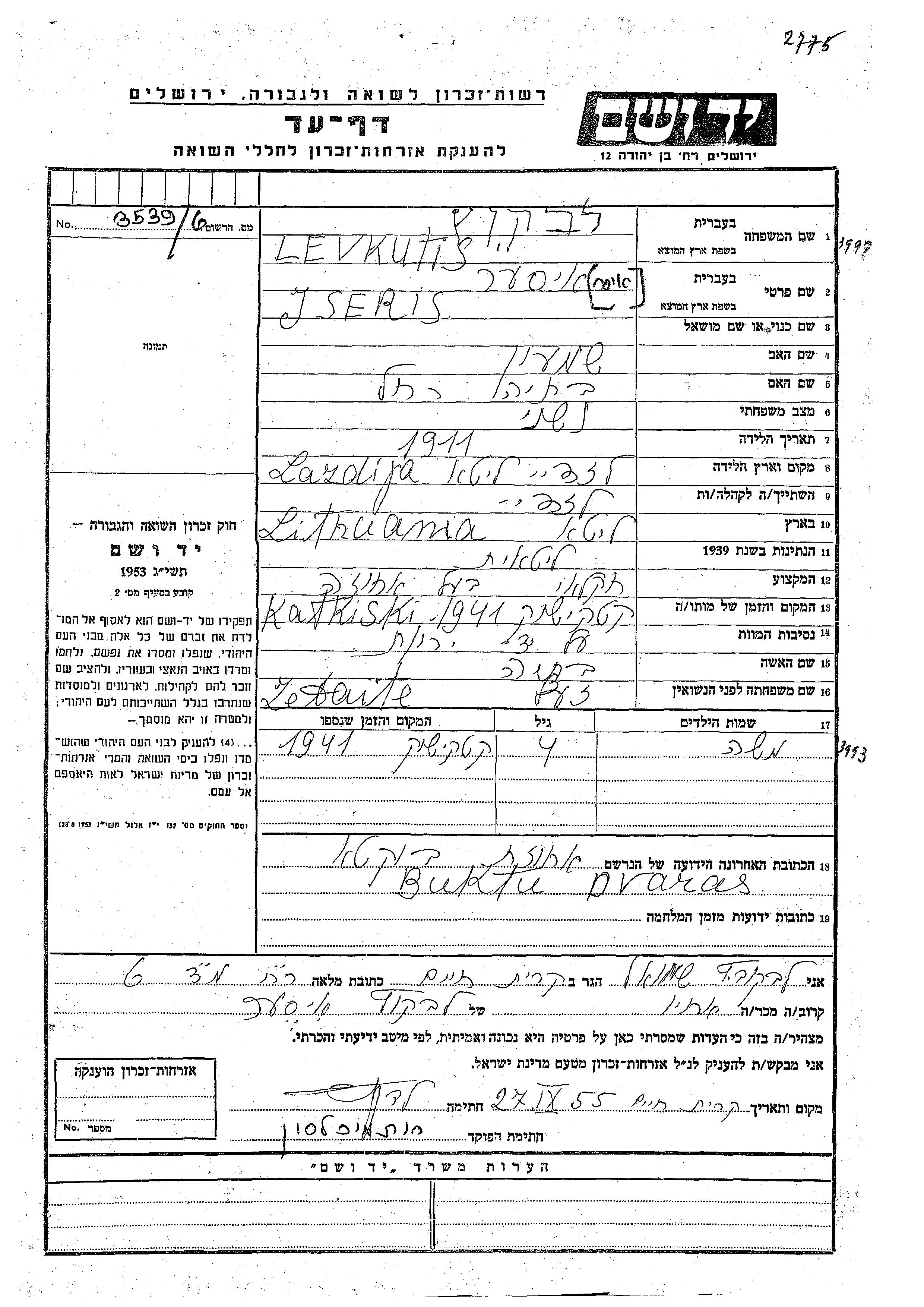Levkutis Moshe endroit inconnu, Feuille de témoignage