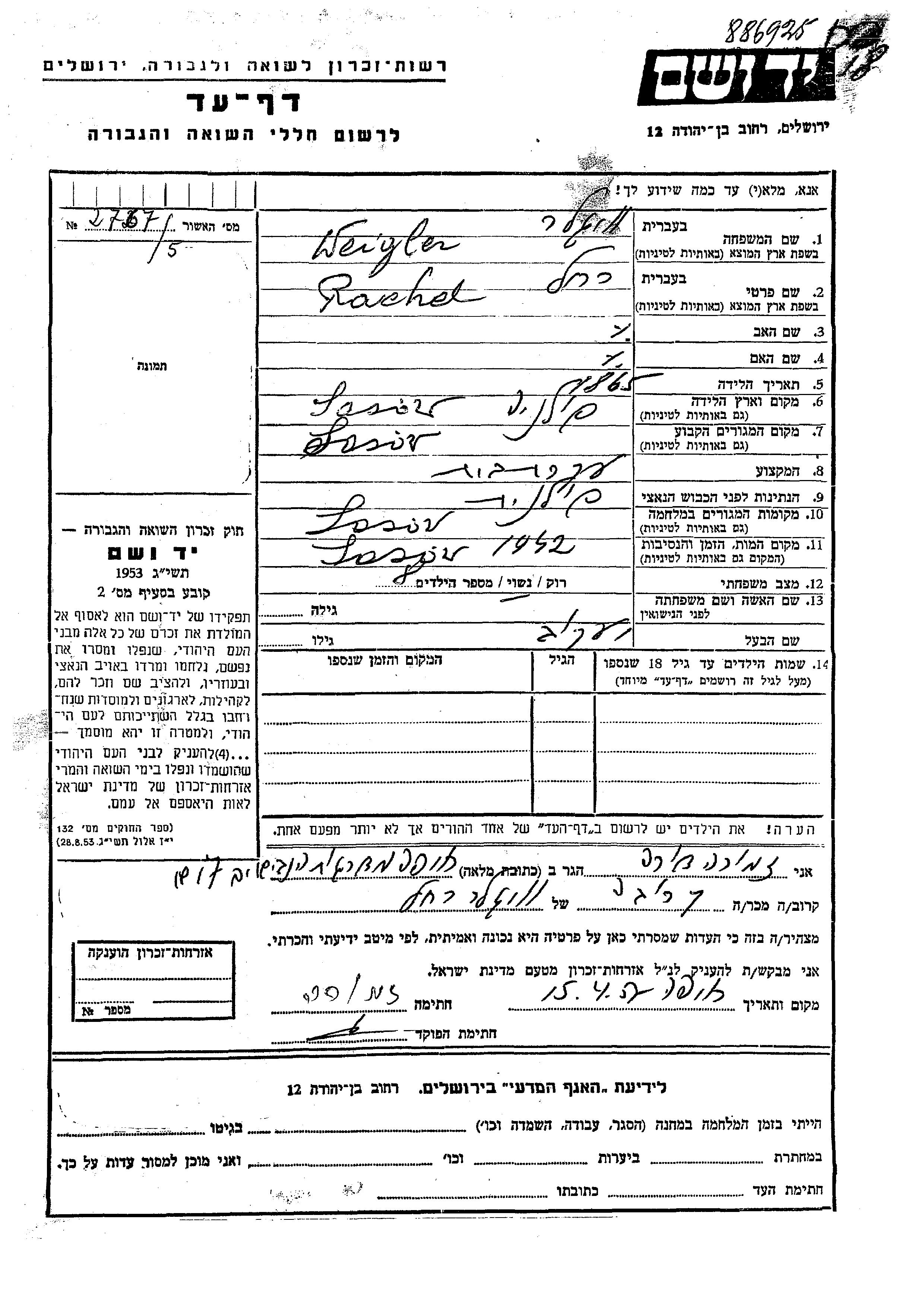 Weigler Rachel 1865 Sasov, Feuille de témoignage