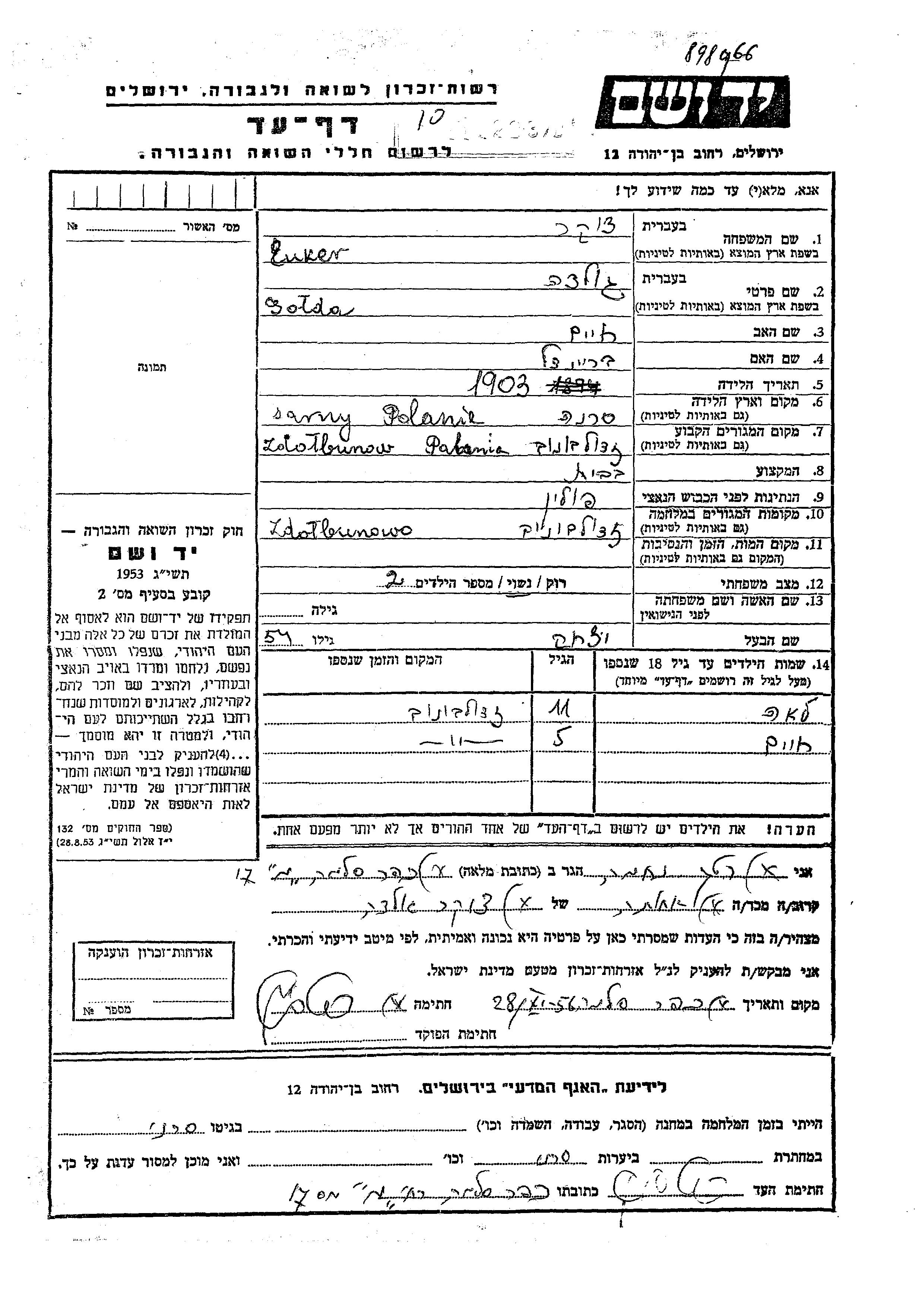 Yad Vashem - Pages of Testimony Names Memorial Collection