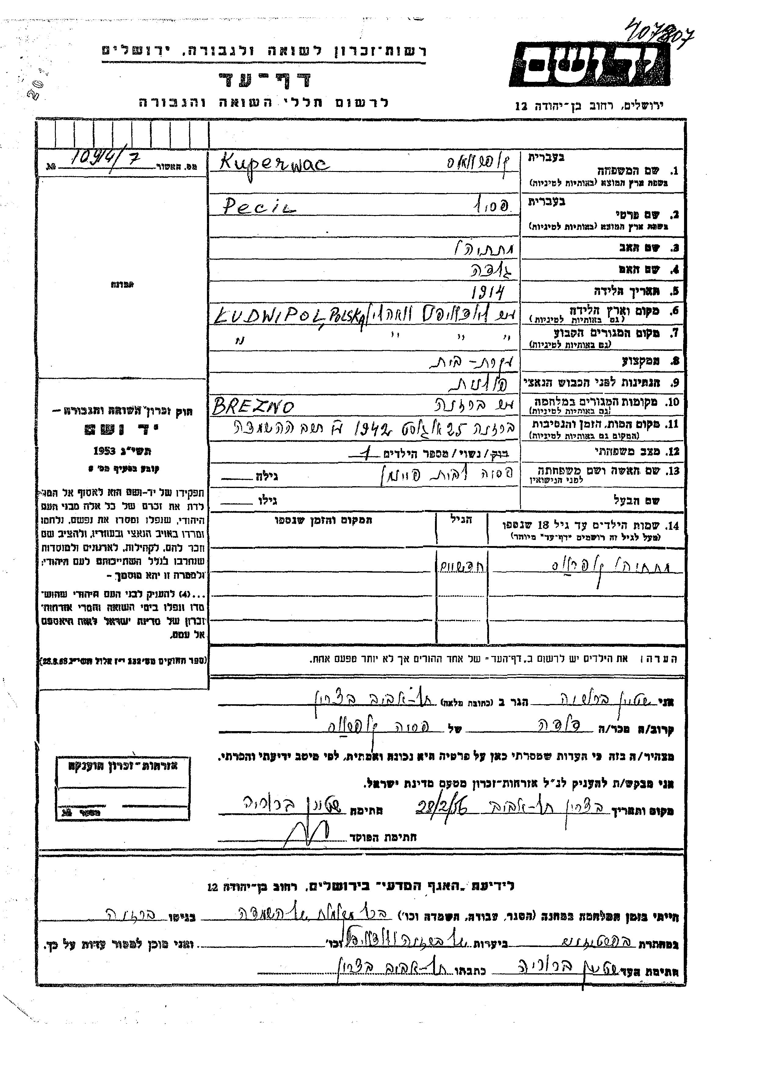 Kuperwac Matatiahu Ludwipol, Pologne Feuille de témoignage
