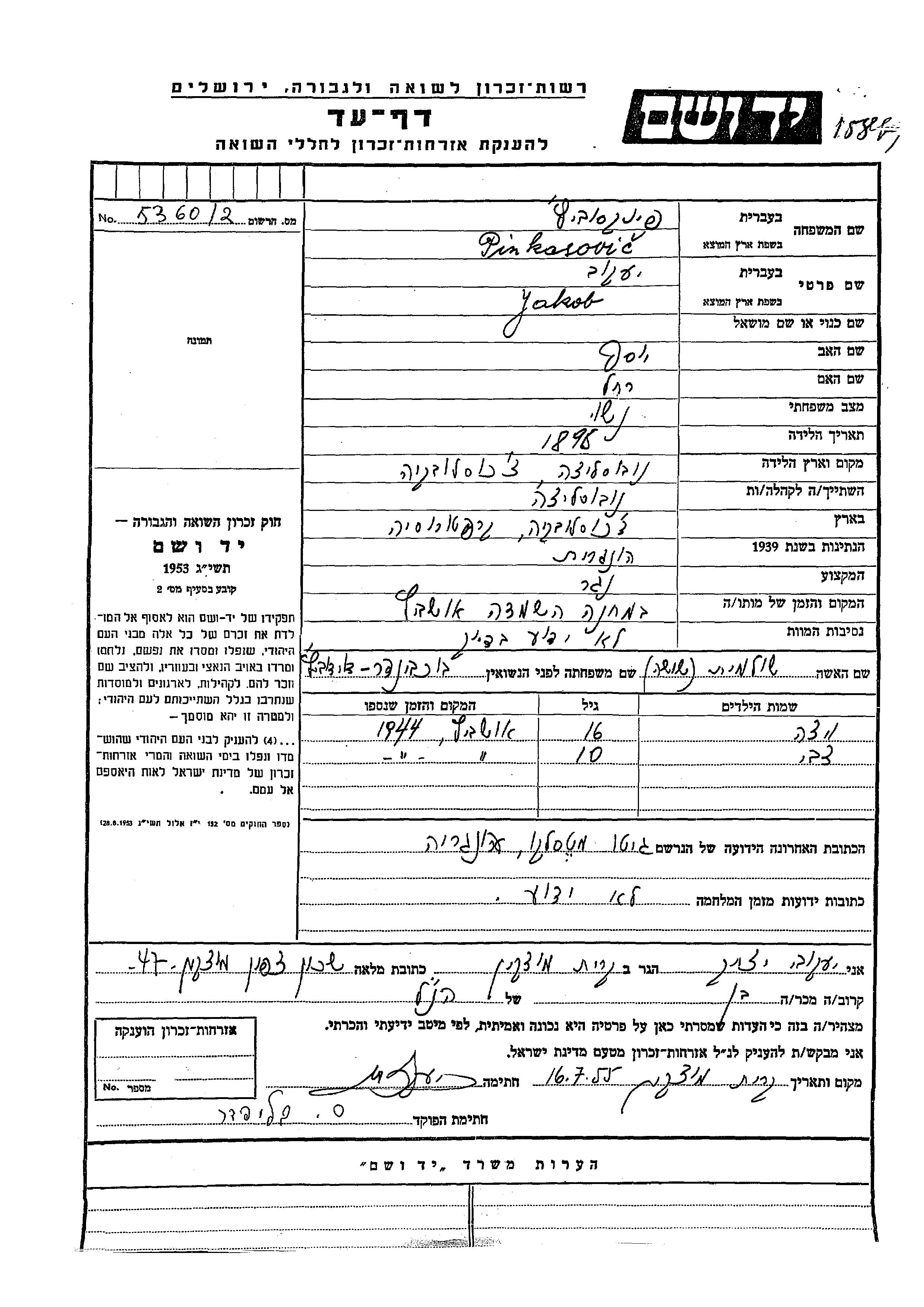 Yad Vashem - Pages of Testimony Names Memorial Collection