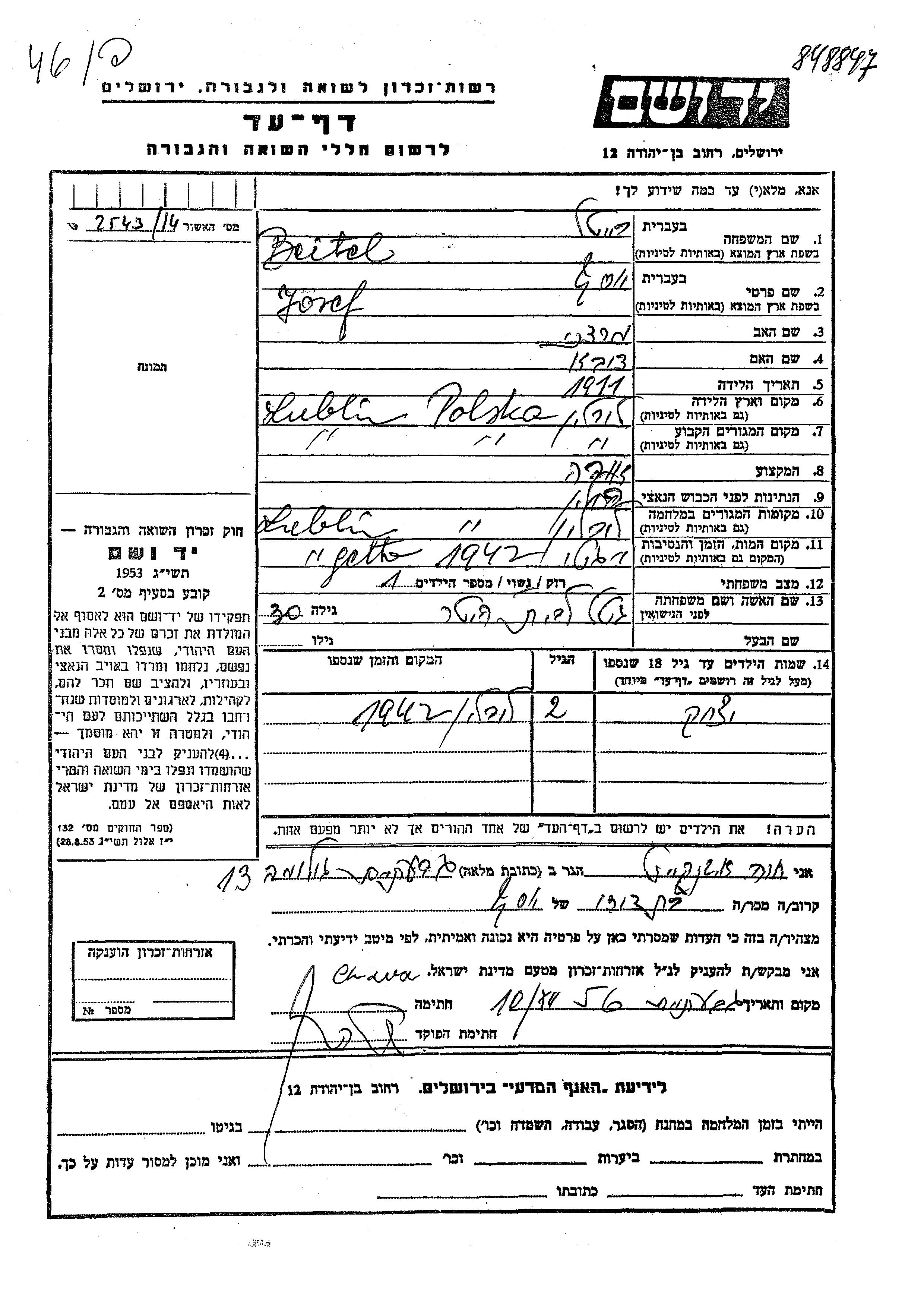 Beitel Yitzkhak Lublin, Pologne Feuille de témoignage