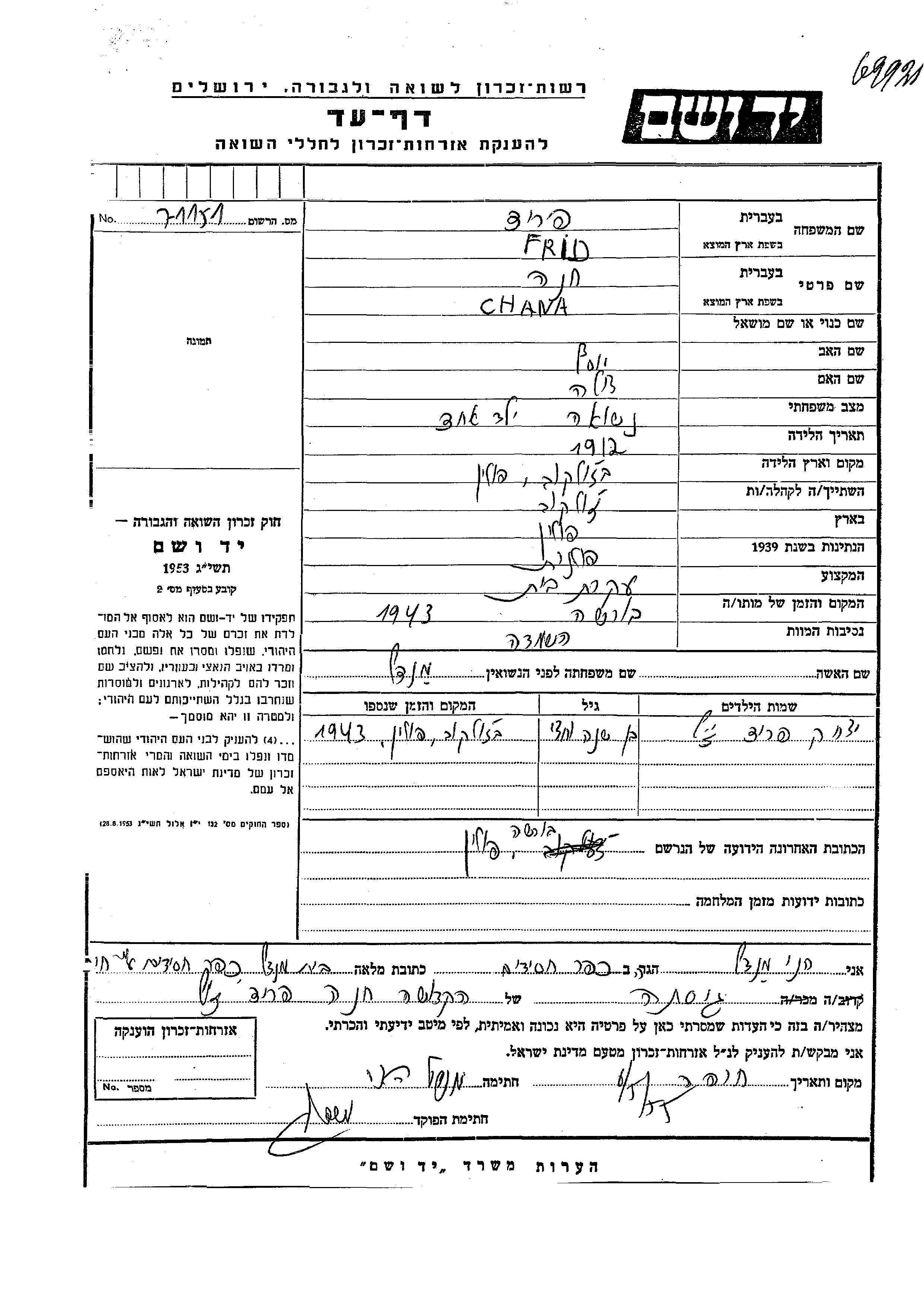 Frid Yitzkhak endroit inconnu, Feuille de témoignage