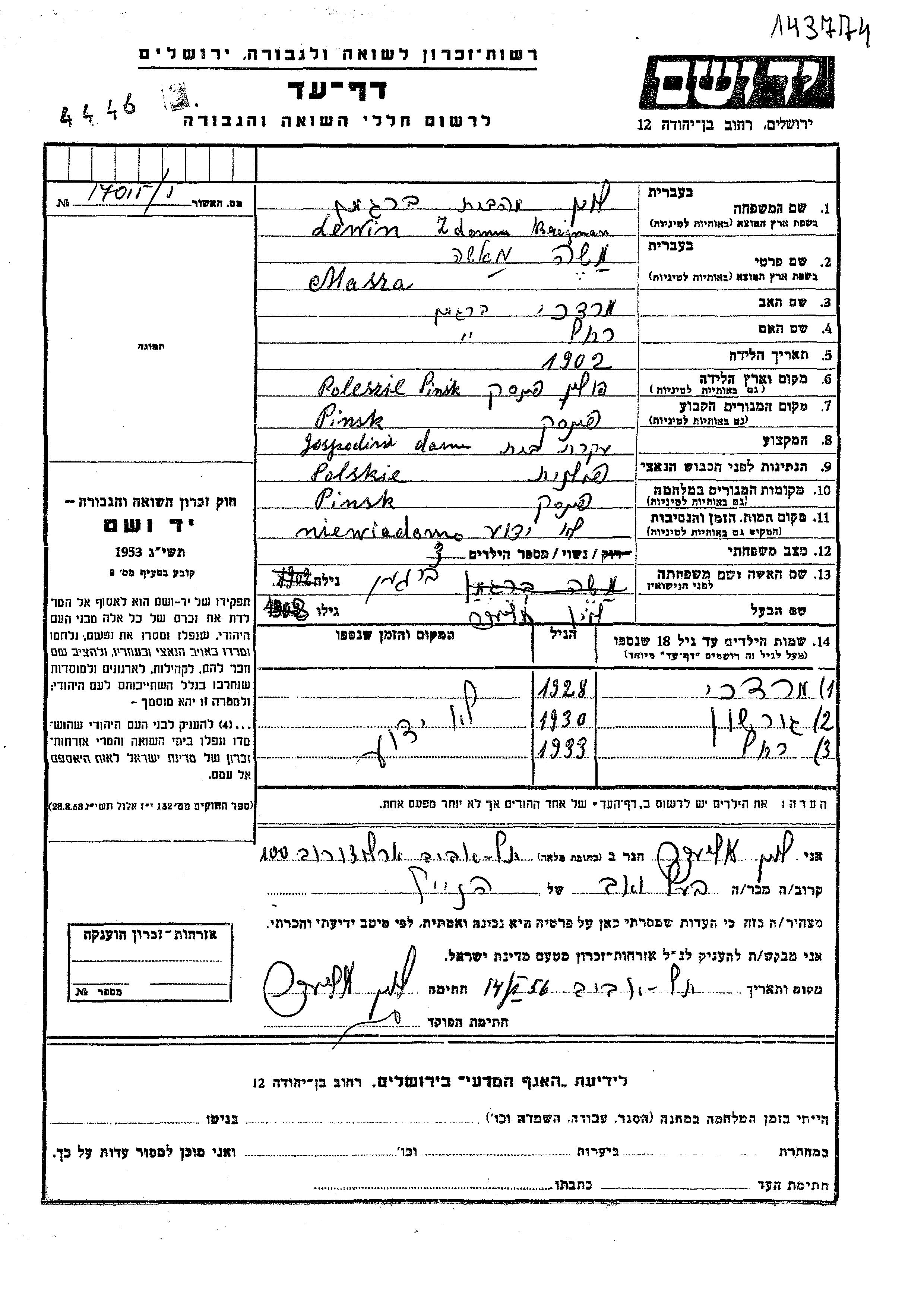 Lewin Gorshon 1930 Pinsk, Pologne Feuille de témoignage