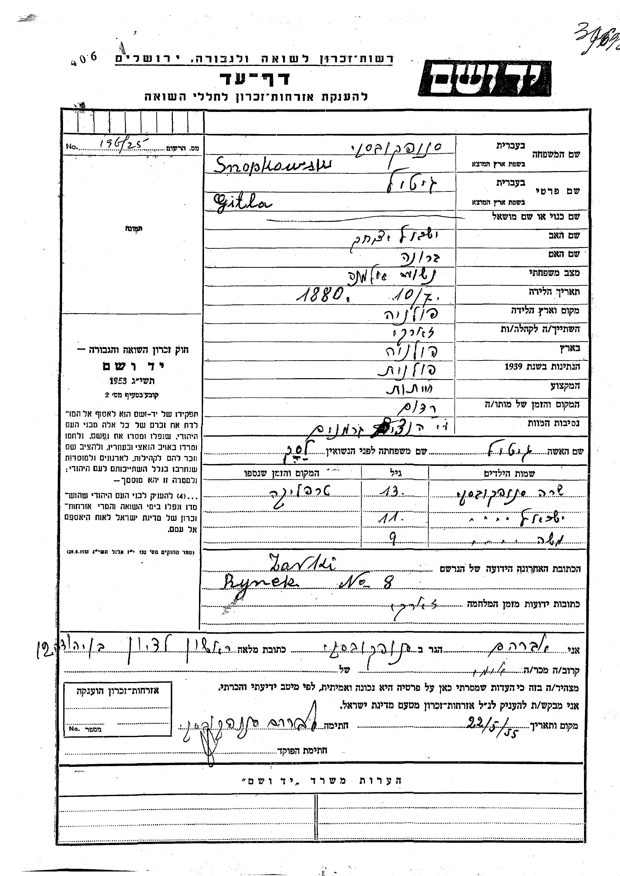 Snopkowski Moshe Zarki, Pologne Feuille de témoignage
