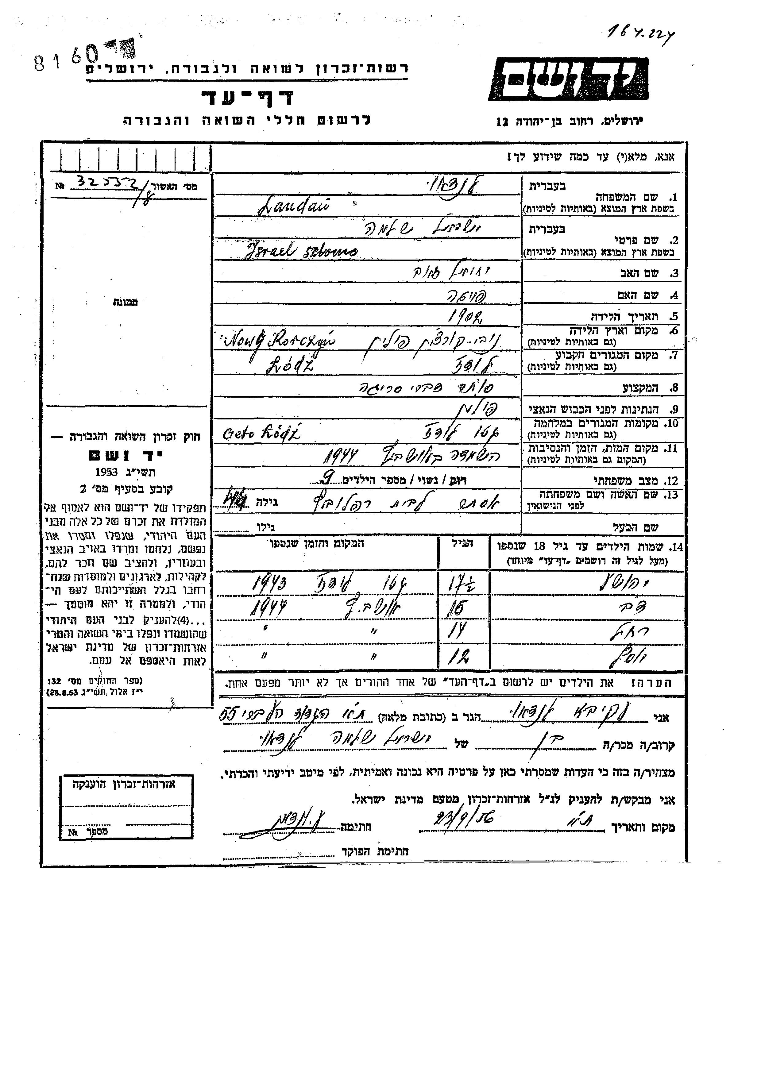 Landau Yosef Lodz, Pologne Feuille de témoignage