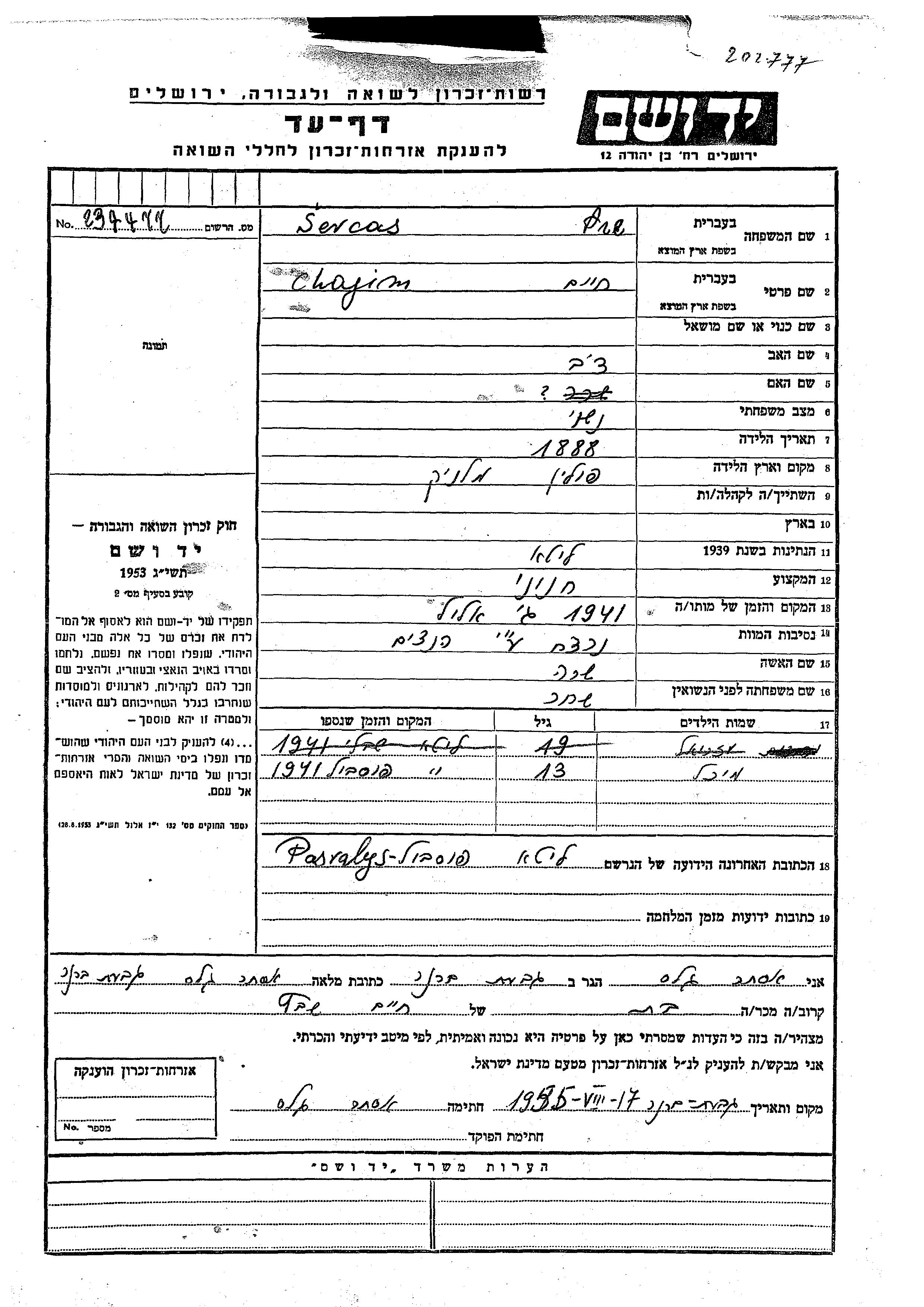 Sercas Azriel Posval, Lituanie Feuille de témoignage