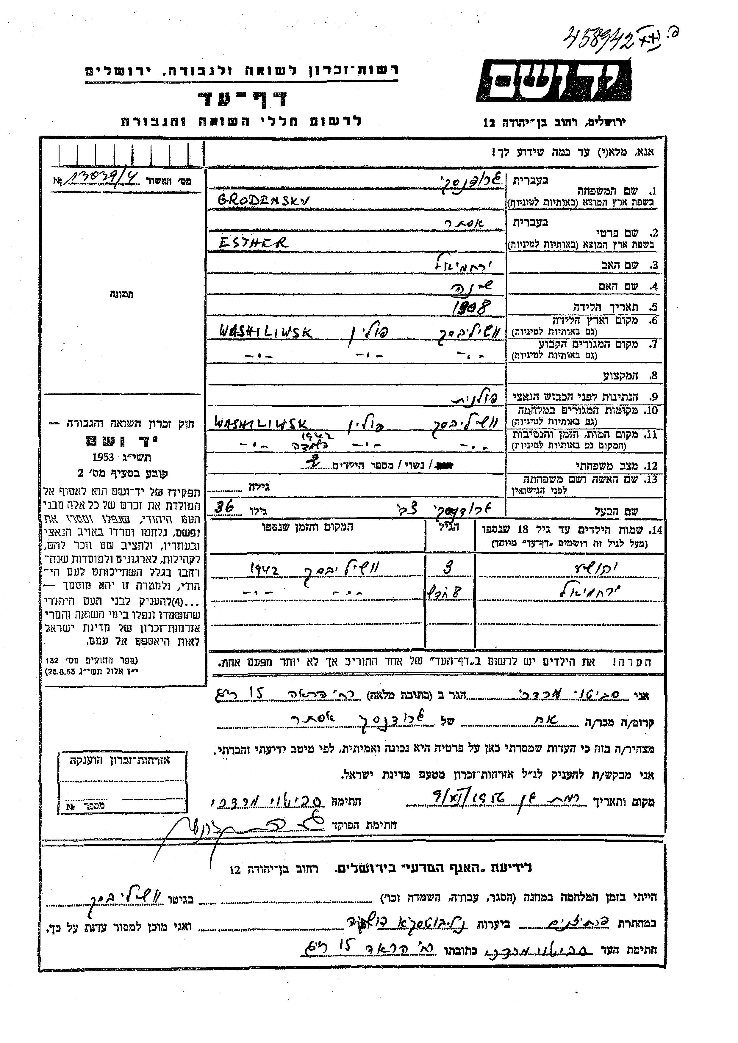 Gordenski Grodenski Yerakhmiel Washiliwsk, Pologne Feuille de témoignage