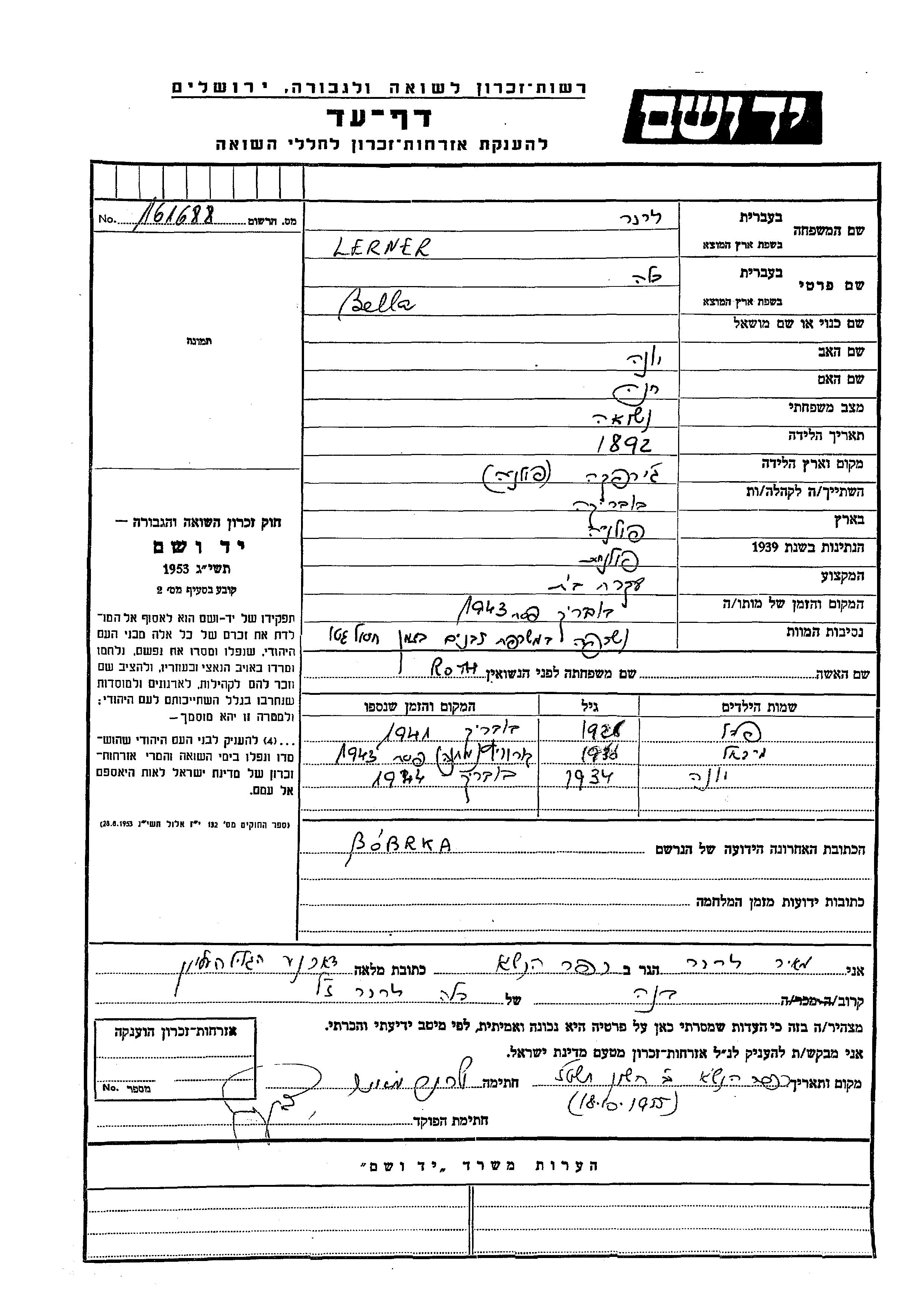 Lerner Mikhael Bobrka, Pologne Feuille de témoignage