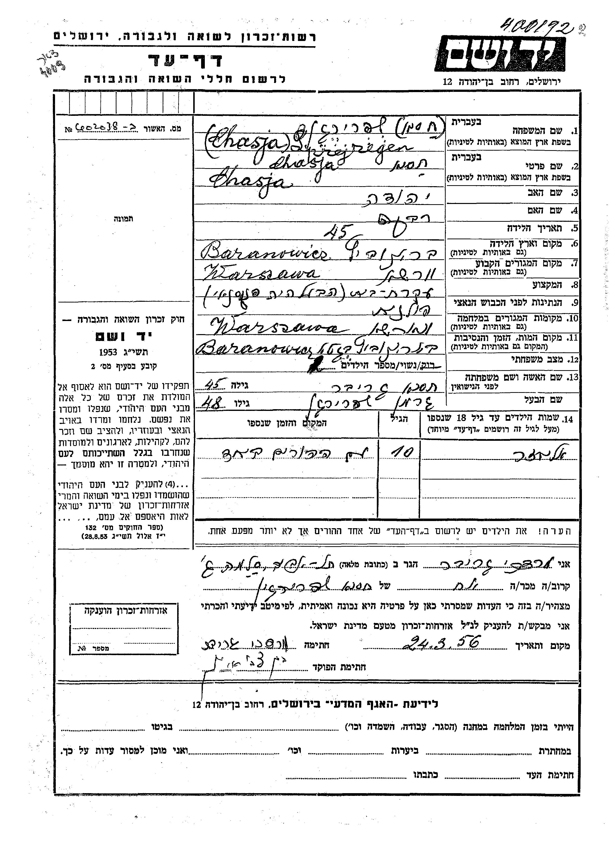 Sprejregen Eliezer Warsaw, Pologne Feuille de témoignage