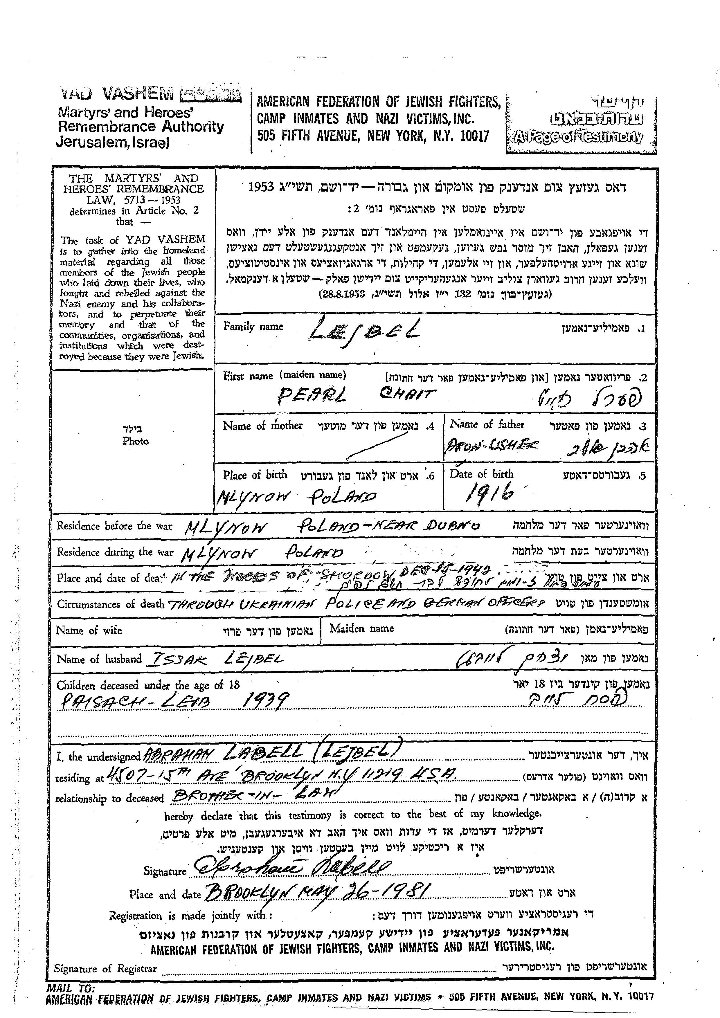 Paisach Leib Lejbel est né en 1939, fils de Issak Lejbel et de Pearl née Chait. Il était Enfant. Avant la seconde guerre mondiale il vivait à Młynów, Pologne. Au cours de la guerre, il était à Młynów, Pologne.